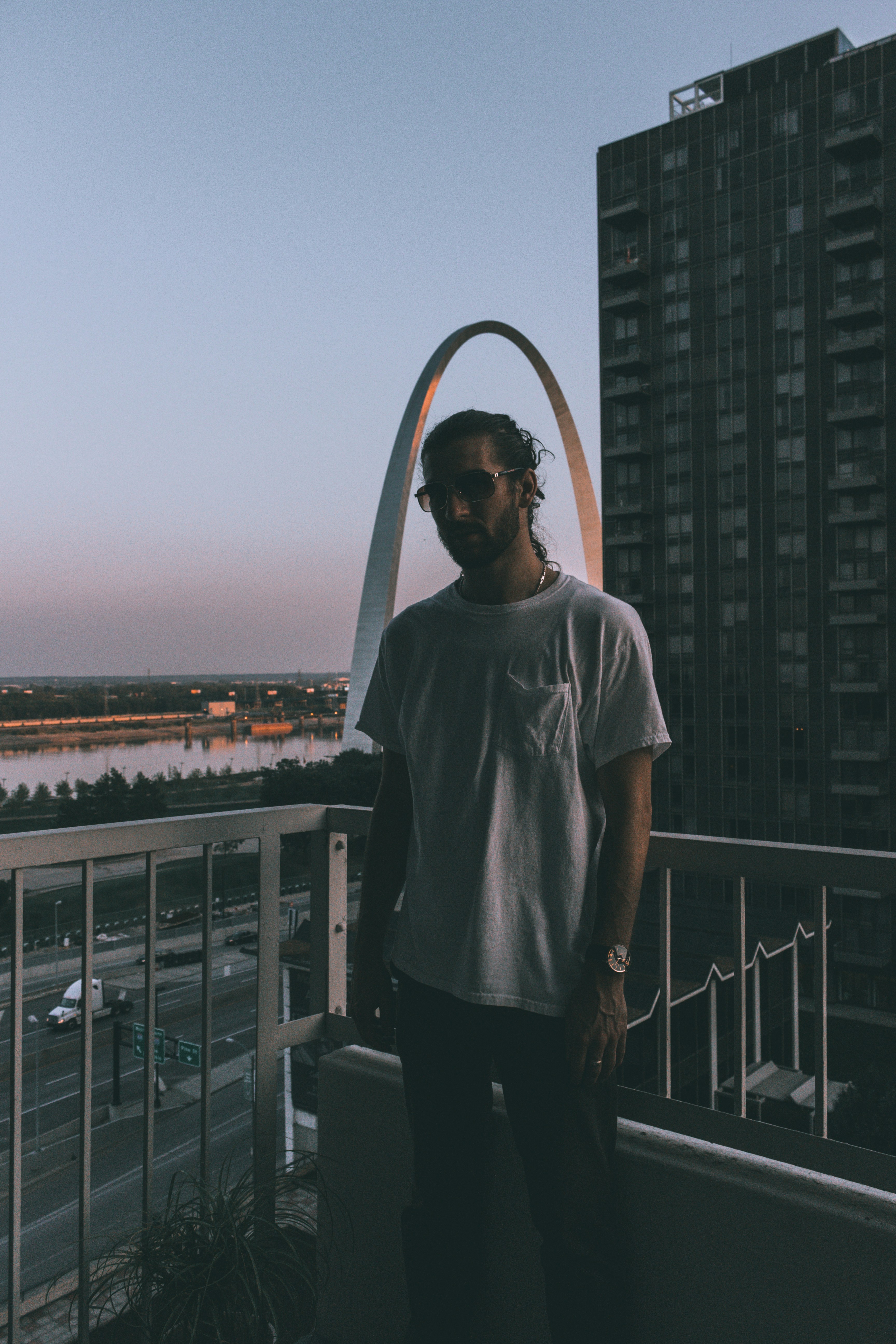 男,男,屋頂,圍欄,欄桿,摩天大樓,河流,水,塔,模型,城市景觀,城市,胡須,長發(fā),黃金時刻,光,暗,夜,城,外