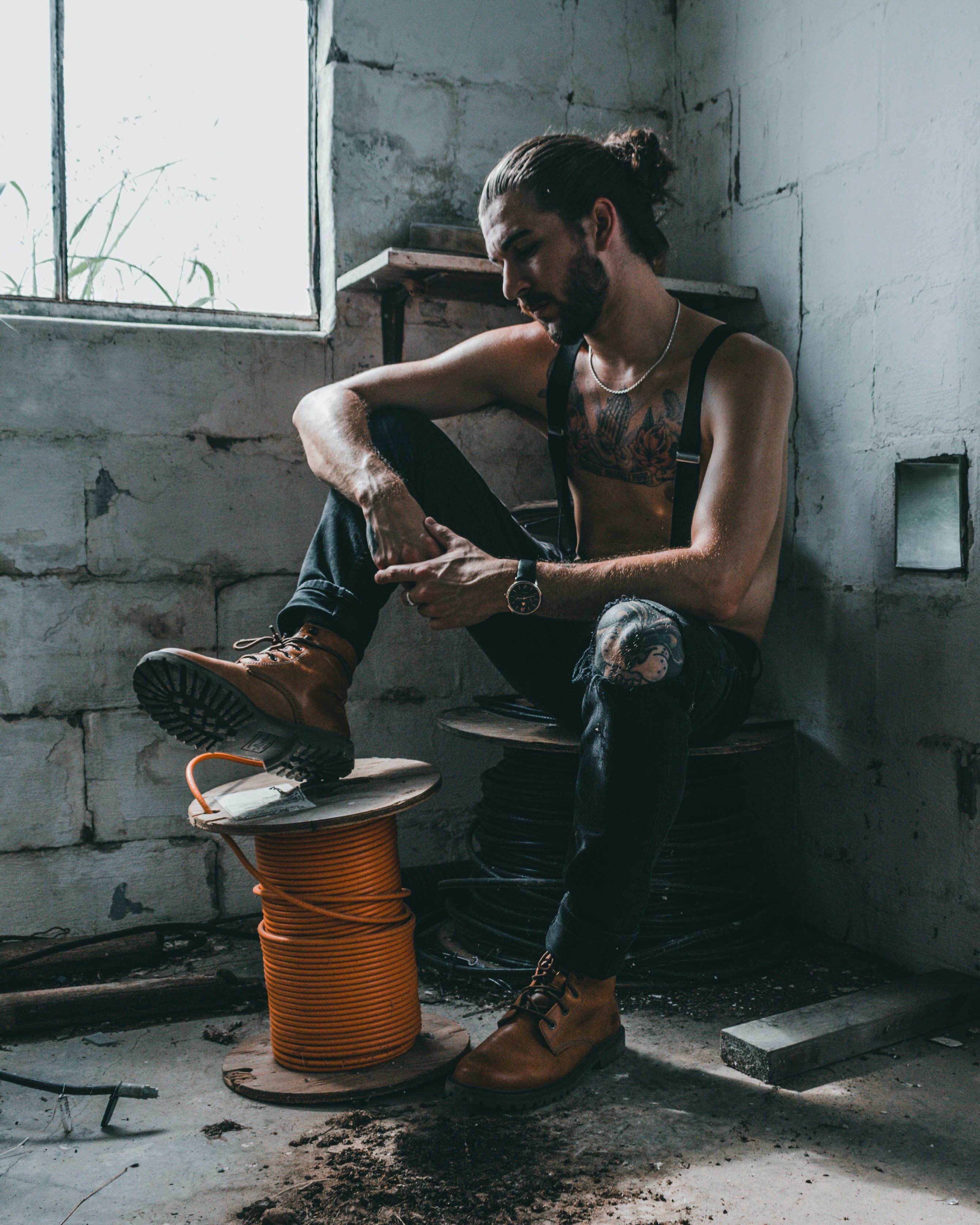 男,男,墻,白,線纜,線軸,工作空間,工業(yè),文身,外觀,造型,吊襪帶,無衣,襯衫,冷,內(nèi),外,鏈,男人