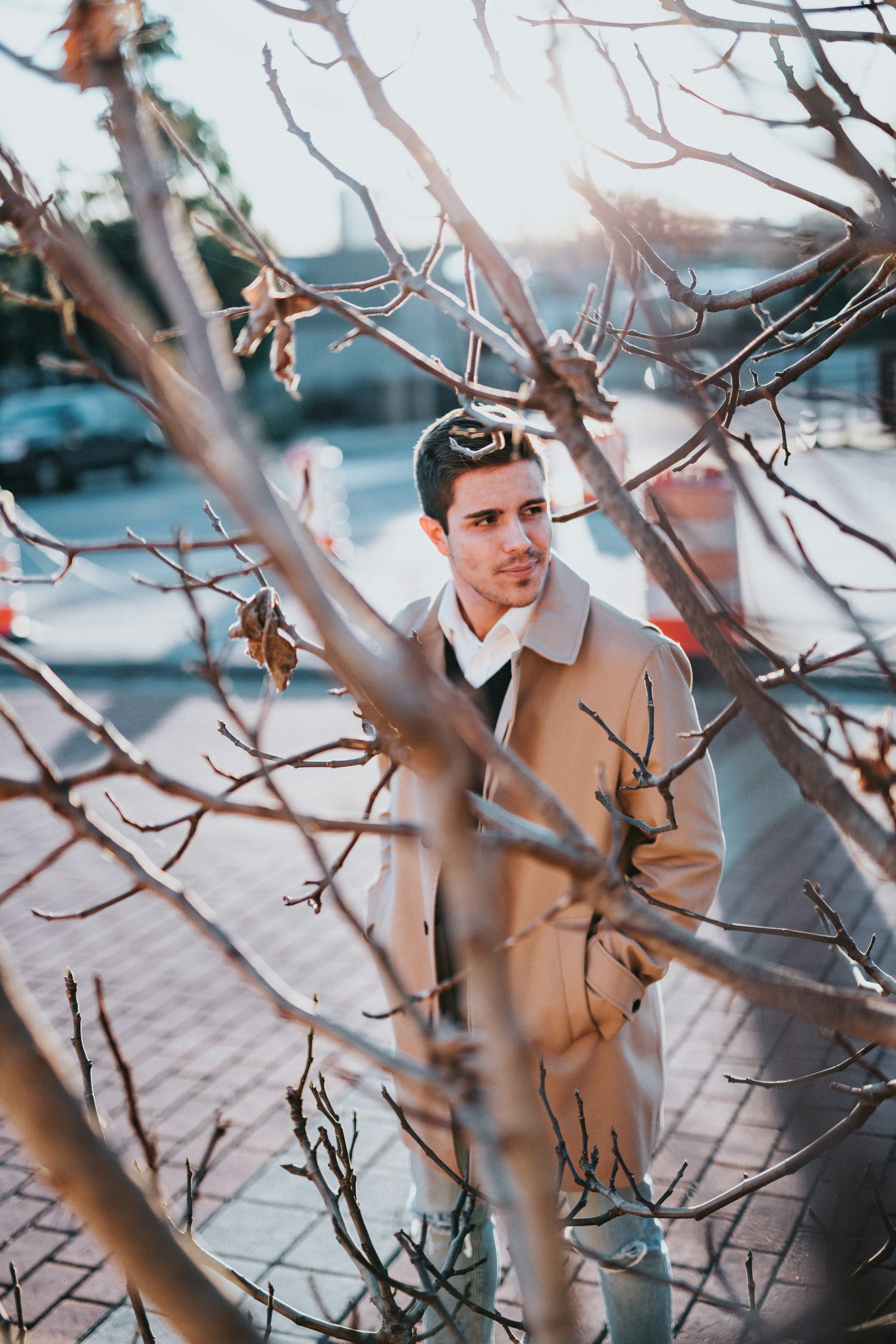 男人,男人,畫像,模特,樹,磚,人行道,道路,鋪路,陽光,自然,家伙,2018,冬天,時尚