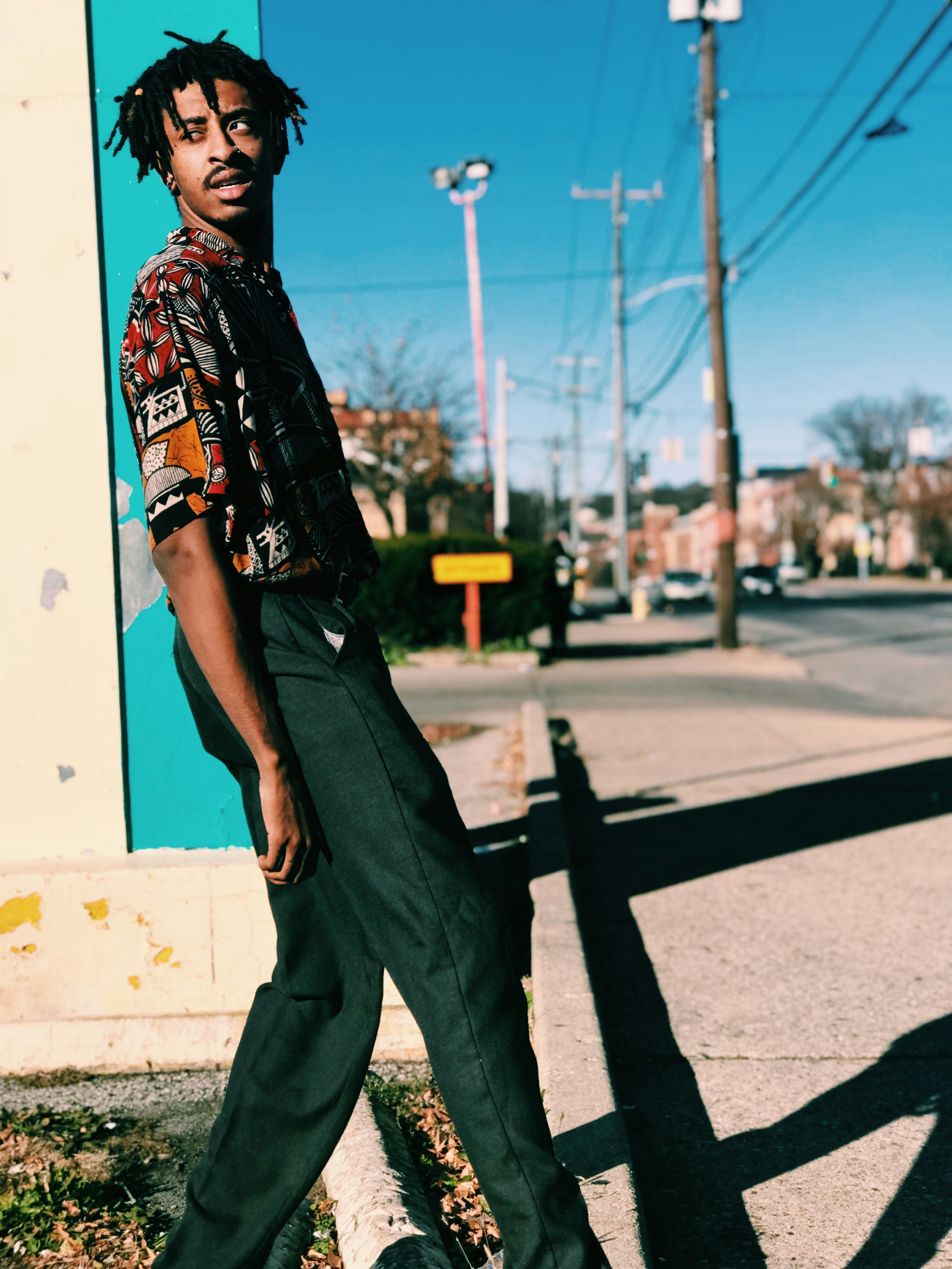 男性,男性,街道,道路,陰影,陽光,藍(lán)色,天空,極點(diǎn),電力,電纜,電線,肖像,模特,襯衫,圖案,GQ,風(fēng)格,街頭攝影,男裝時尚