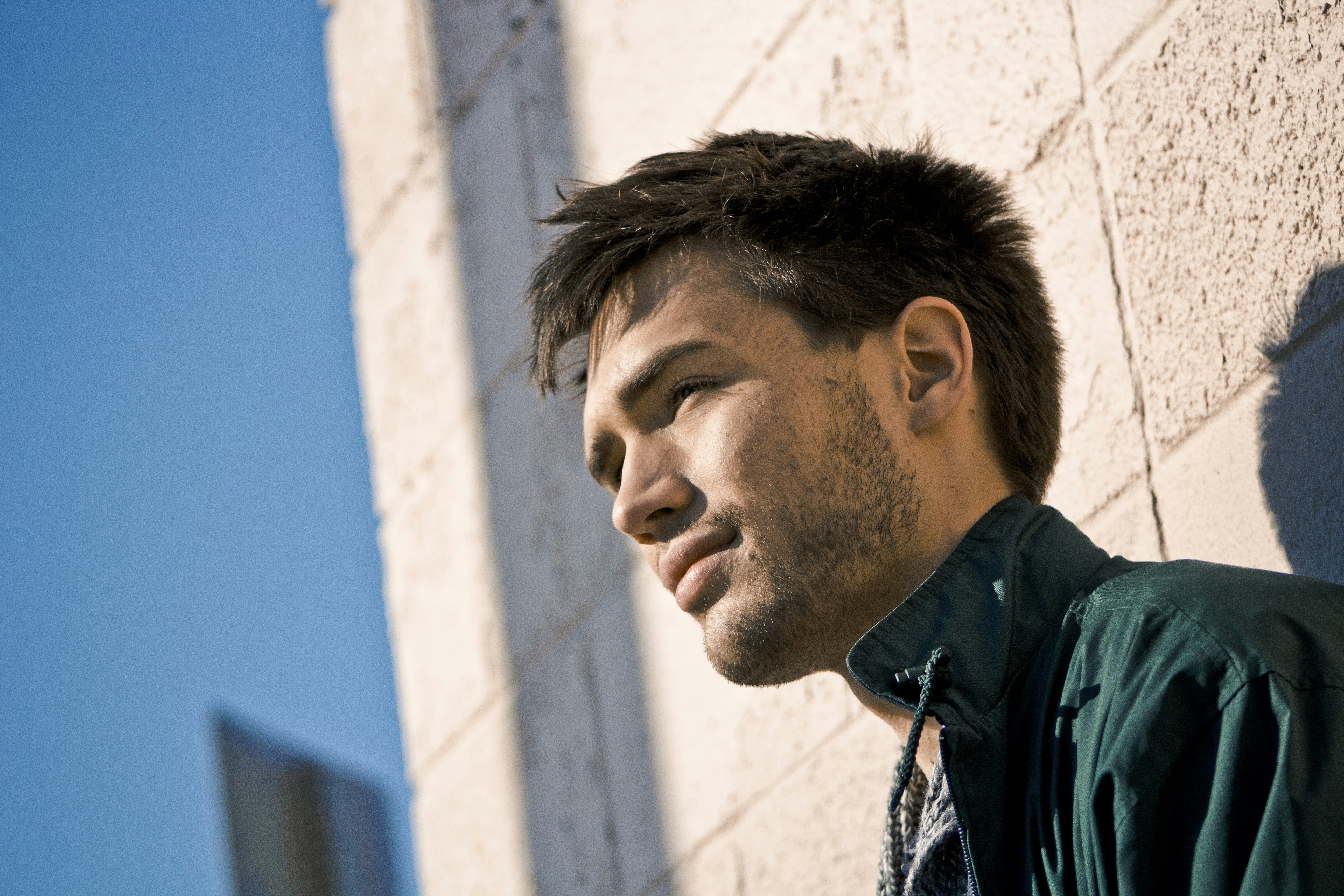 男,男,模特,肖像,臉,墻,陽光,陰影,藍(lán)色,天空,石頭,城市,城市,夾克,頭發(fā),坦率,戶外