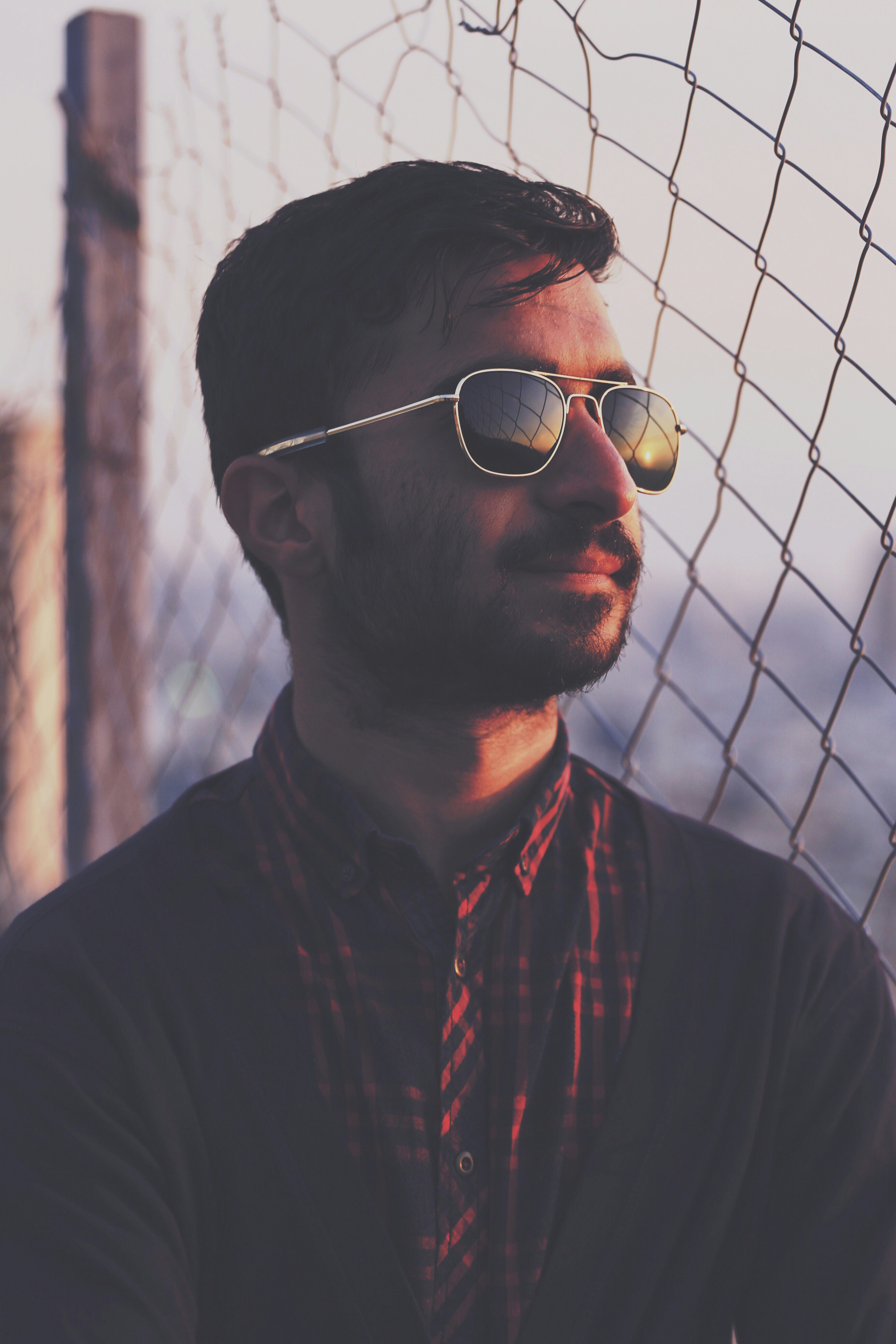 男人,男人,畫像,太陽鏡,模型,反射,圍欄,金屬絲,襯衫,羊毛衫,時裝