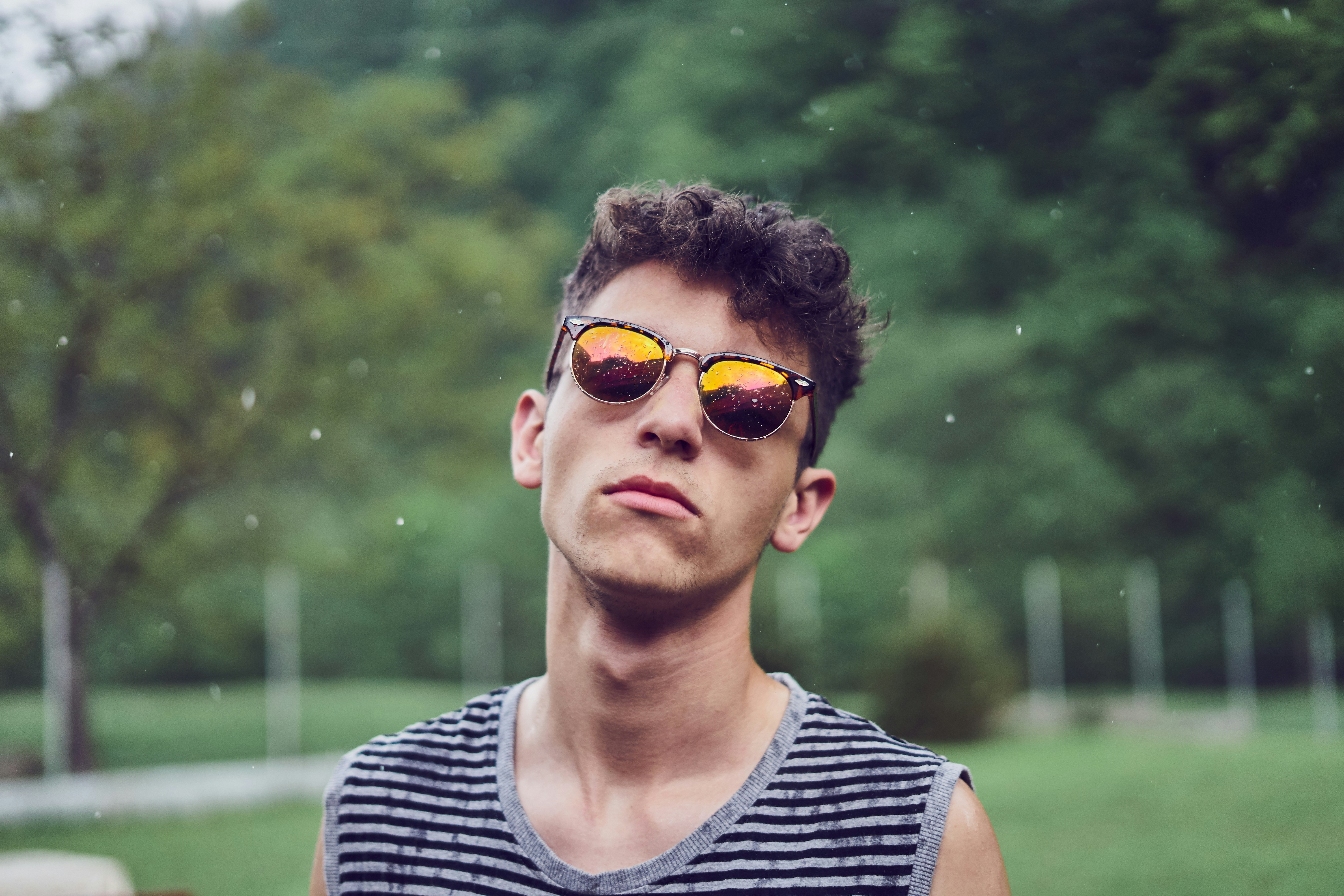 太陽鏡,畫像,雨,雨,波,森林,人,男,年輕人,年輕男性,看相機(jī),太陽鏡,橙色,反射,眼鏡反射