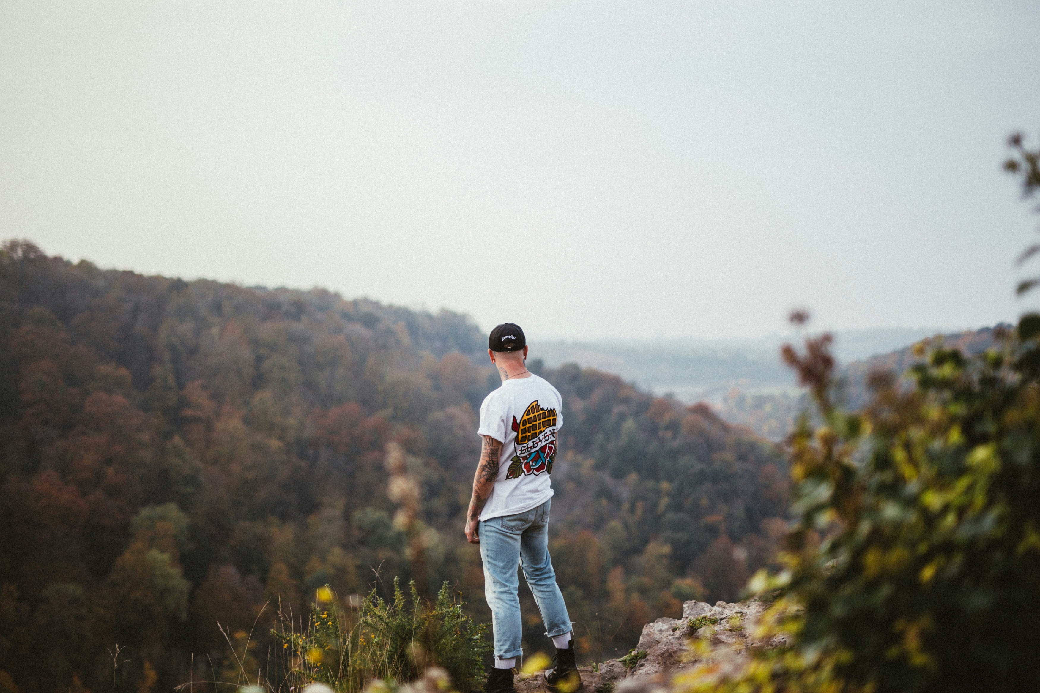 男人,小伙子,男,站,后,邊,高加索,谷,T恤,T恤,文身,牛仔褲,牛仔,帽子,黃昏,霧,景色,距離,旅行,墨水