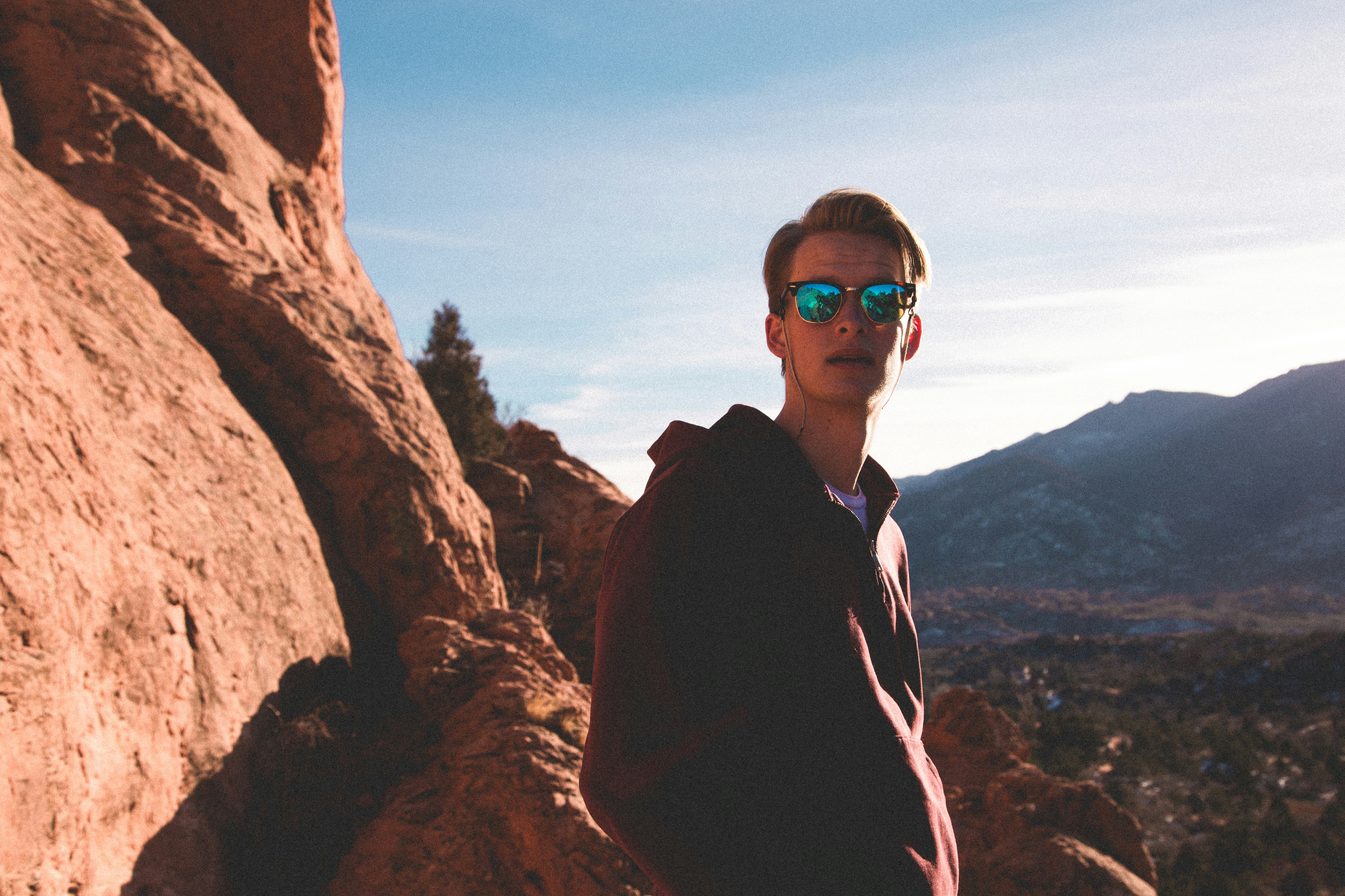 男,男,高加索,搖滾,太陽鏡,鏡像,反射,帽衫,陽光,陰影,山景,風景,風景,科羅拉多,青少年,太陽鏡