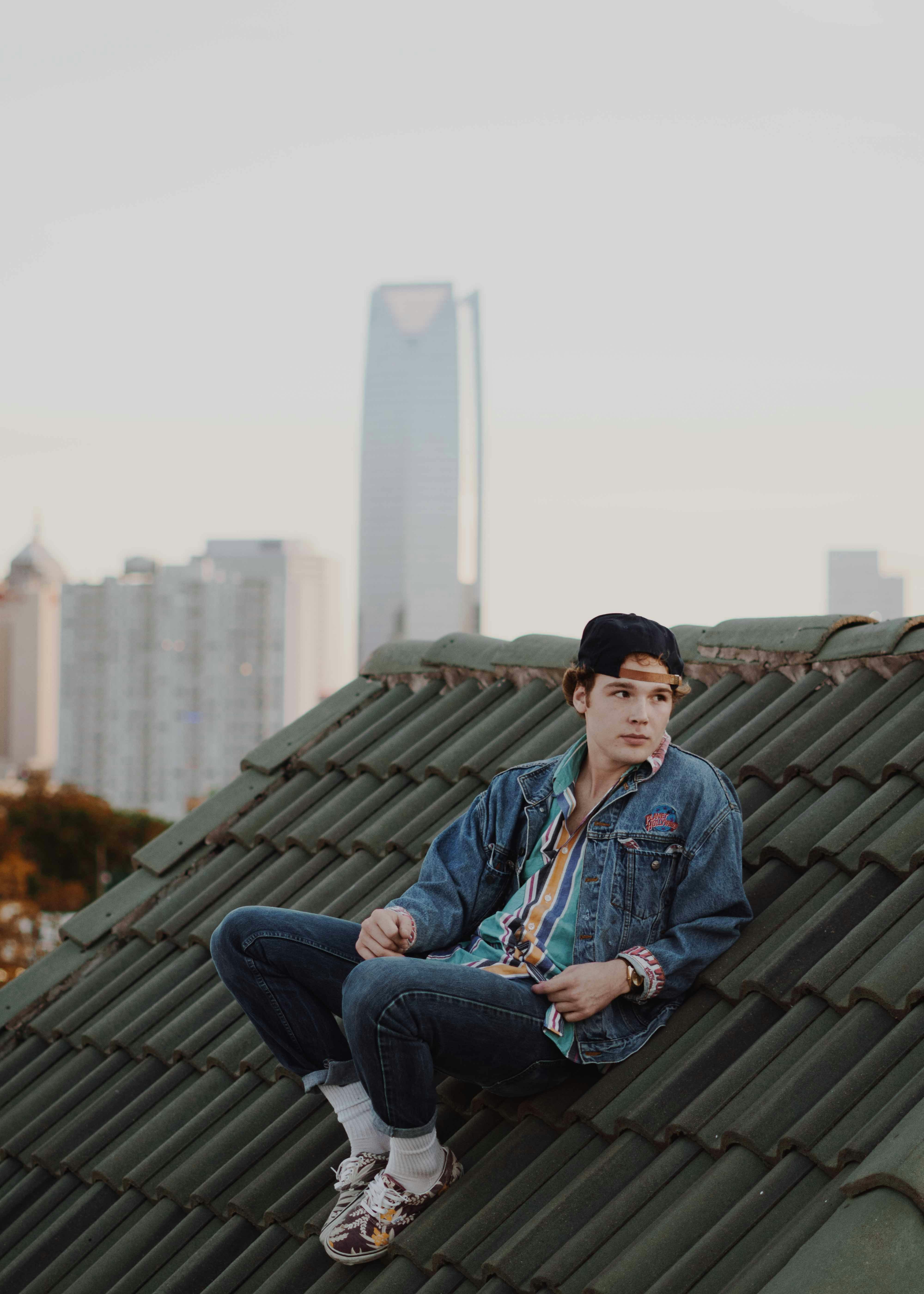 男,男,屋頂,時裝,風格,帽子,牛仔夾克,復古,復古,瓷磚,坐姿,模特,OKC,老式衣服,城市