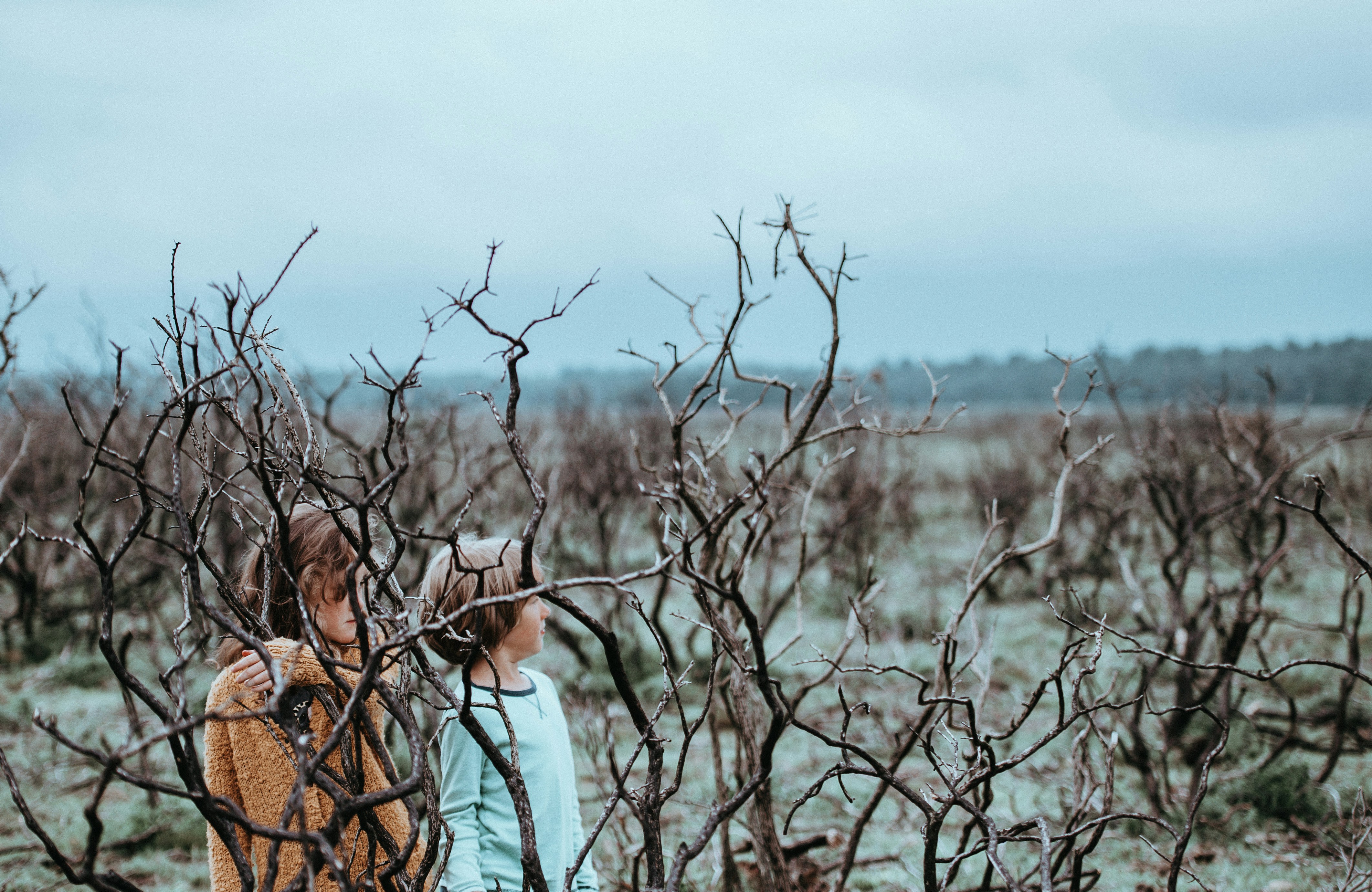 森林,自然,兒童,男孩,女孩,步行,民俗,戶外,秋天,秋天,枯樹,灌木,喜怒無常