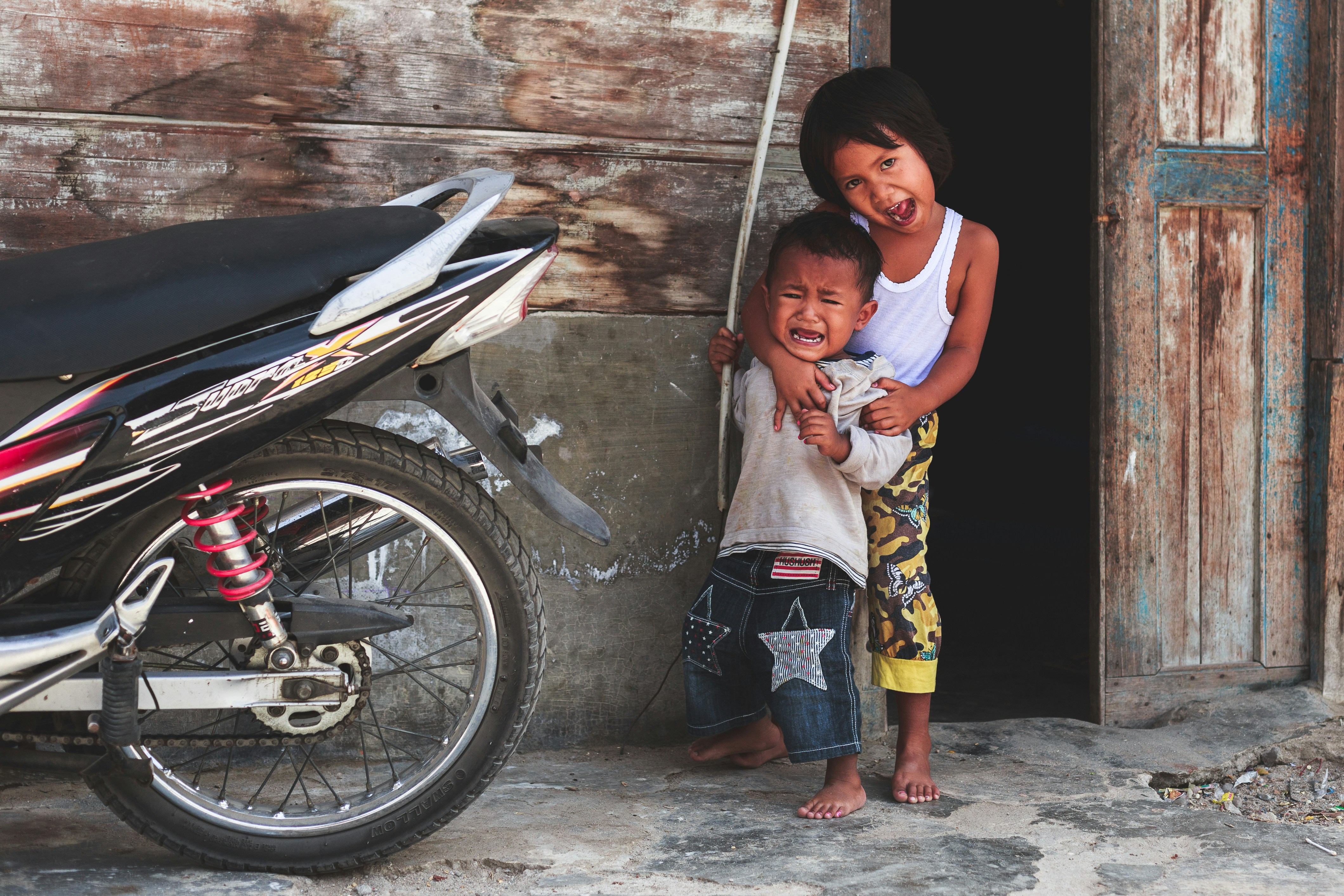 兄弟姐妹,哭,孩子,汽車,街道,嬉戲,蹣跚學(xué)步的孩子,姐姐,大姐姐,牽著手,安慰,同情,安慰,街景,木頭,門,房子,自行車