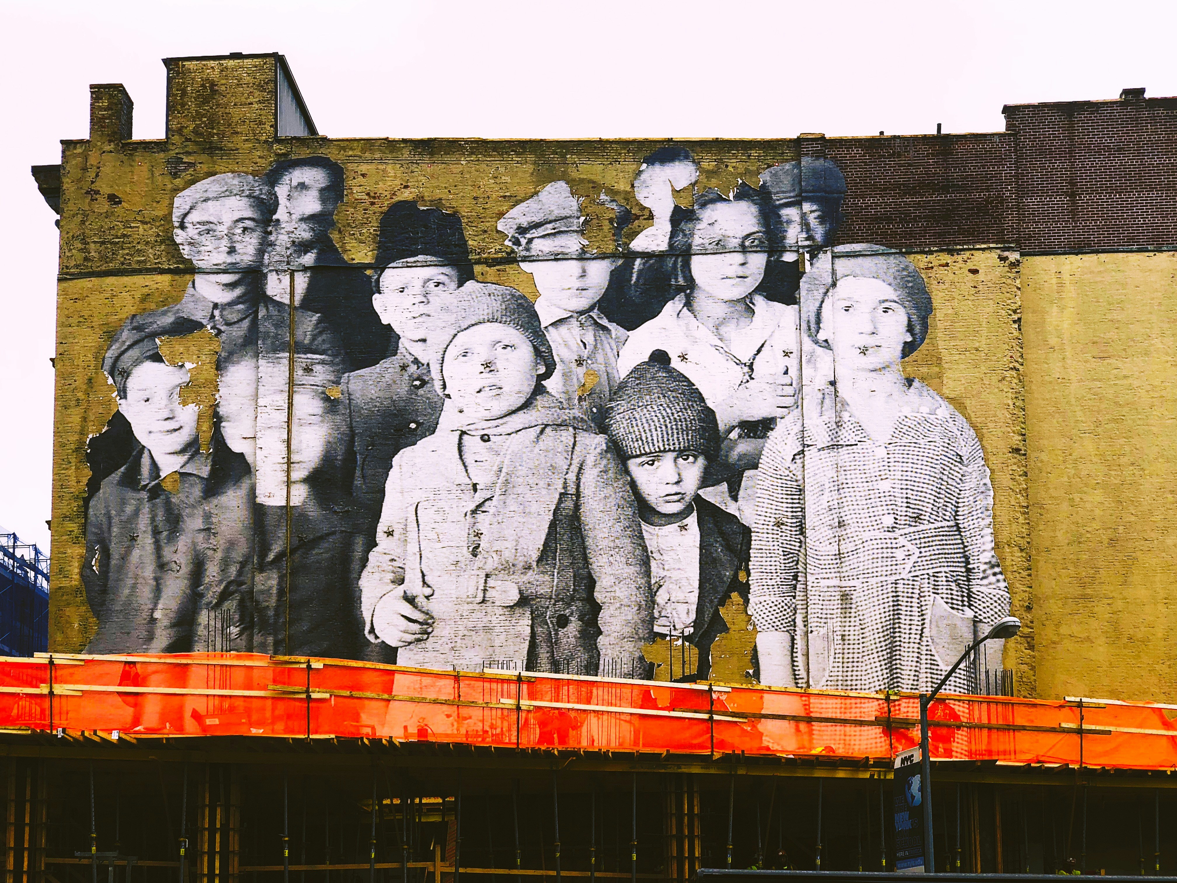 墻壁,城市,繪畫,涂鴉,城市,建筑,人行道,門面,人,孩子,紅色,橙色,磚頭,粘貼,標(biāo)簽,藝術(shù),藝術(shù)品,紐約,封面