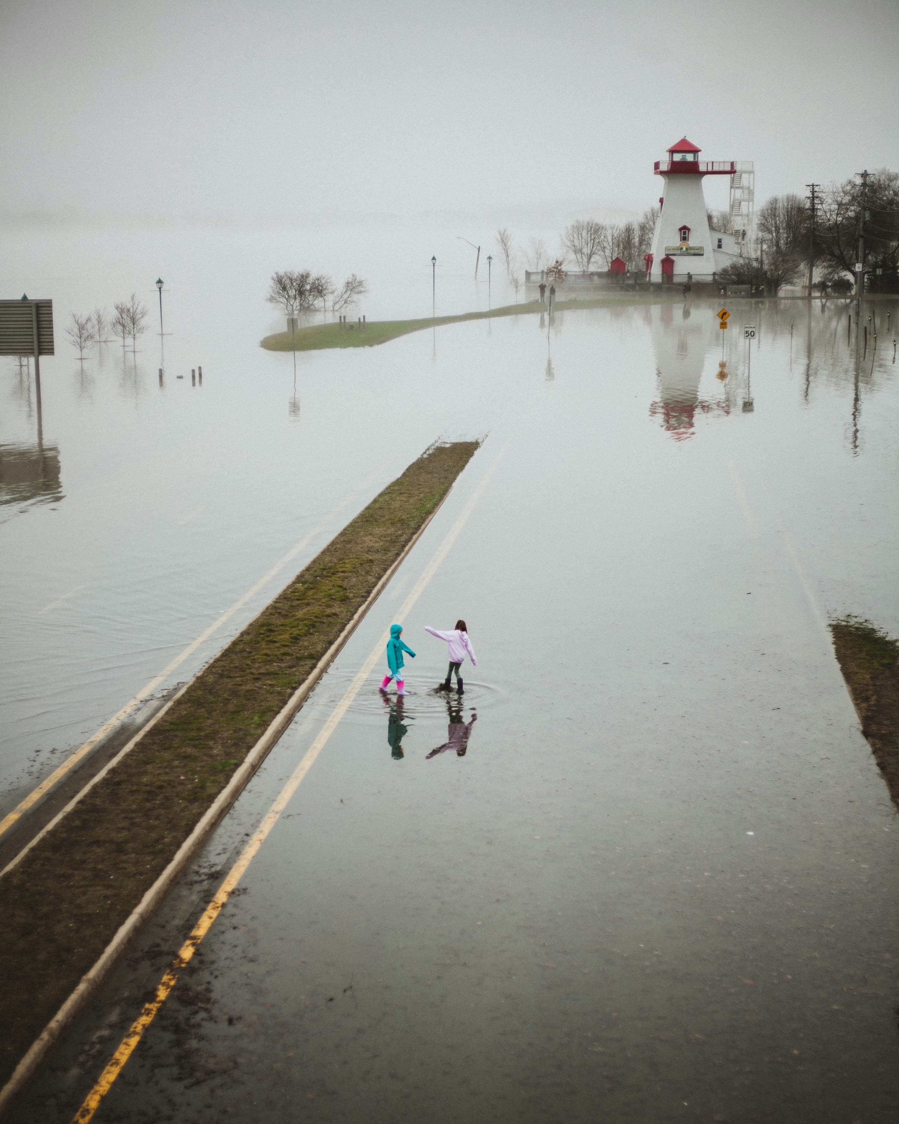 燈塔、水、洪水、停車場、兒童、倒影、霧、霧、人、戶外、游戲、水坑、游戲、云、灰色、漣漪、孩子、女孩、雨靴、橡膠靴