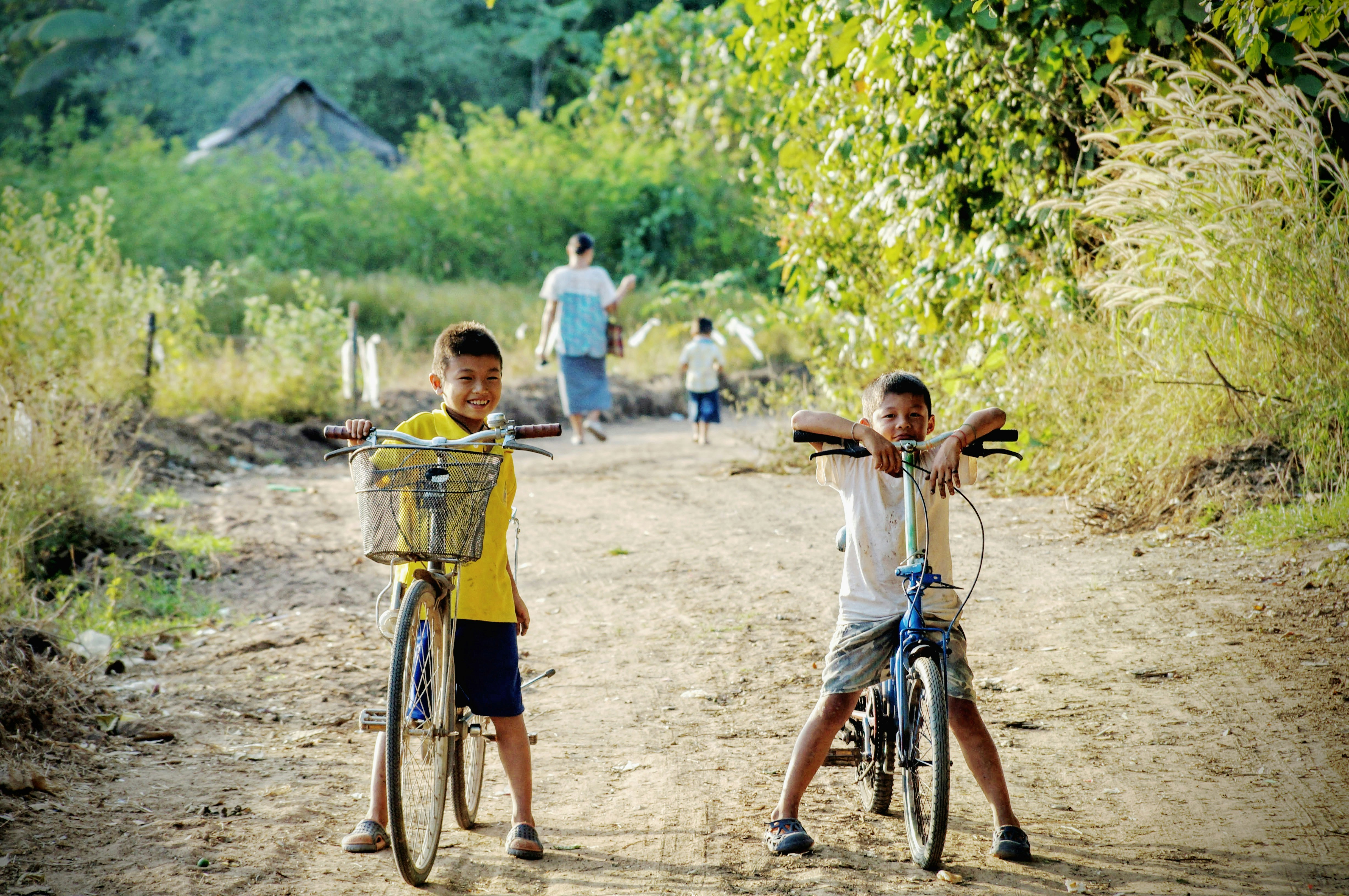 孩子,道路,街道,布景,模糊,植物,綠色,陽光,光明,笑聲,娛樂,玩耍,朋友,男孩,孩子,微笑,年輕,泰國,自行車