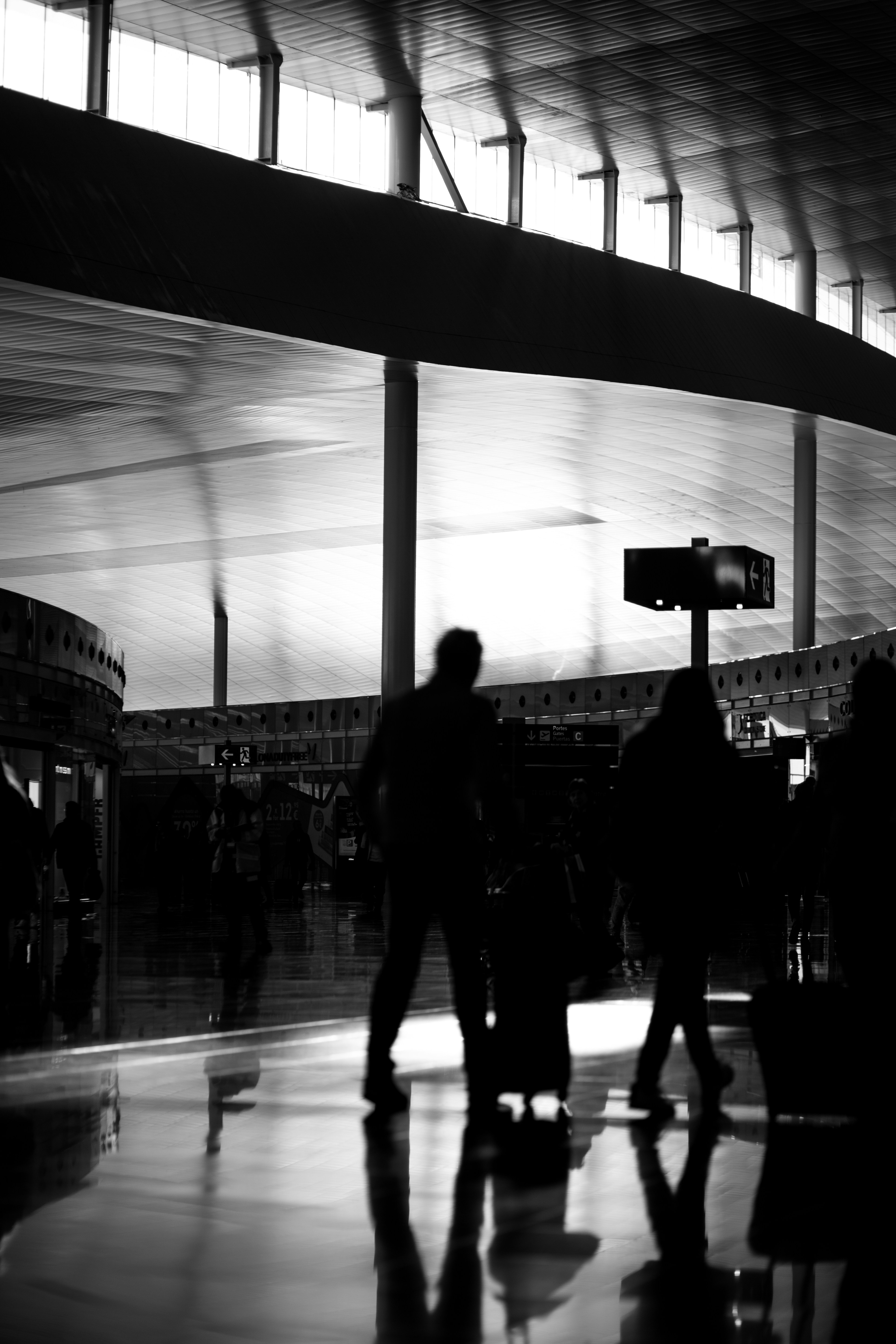 black and white,reflection,airport,people,travel,monochrome,dark,suitcase,windows,skylight,barcelona–el prat airport,el prat de llobregat,spain,candid,dark and light,barcelona