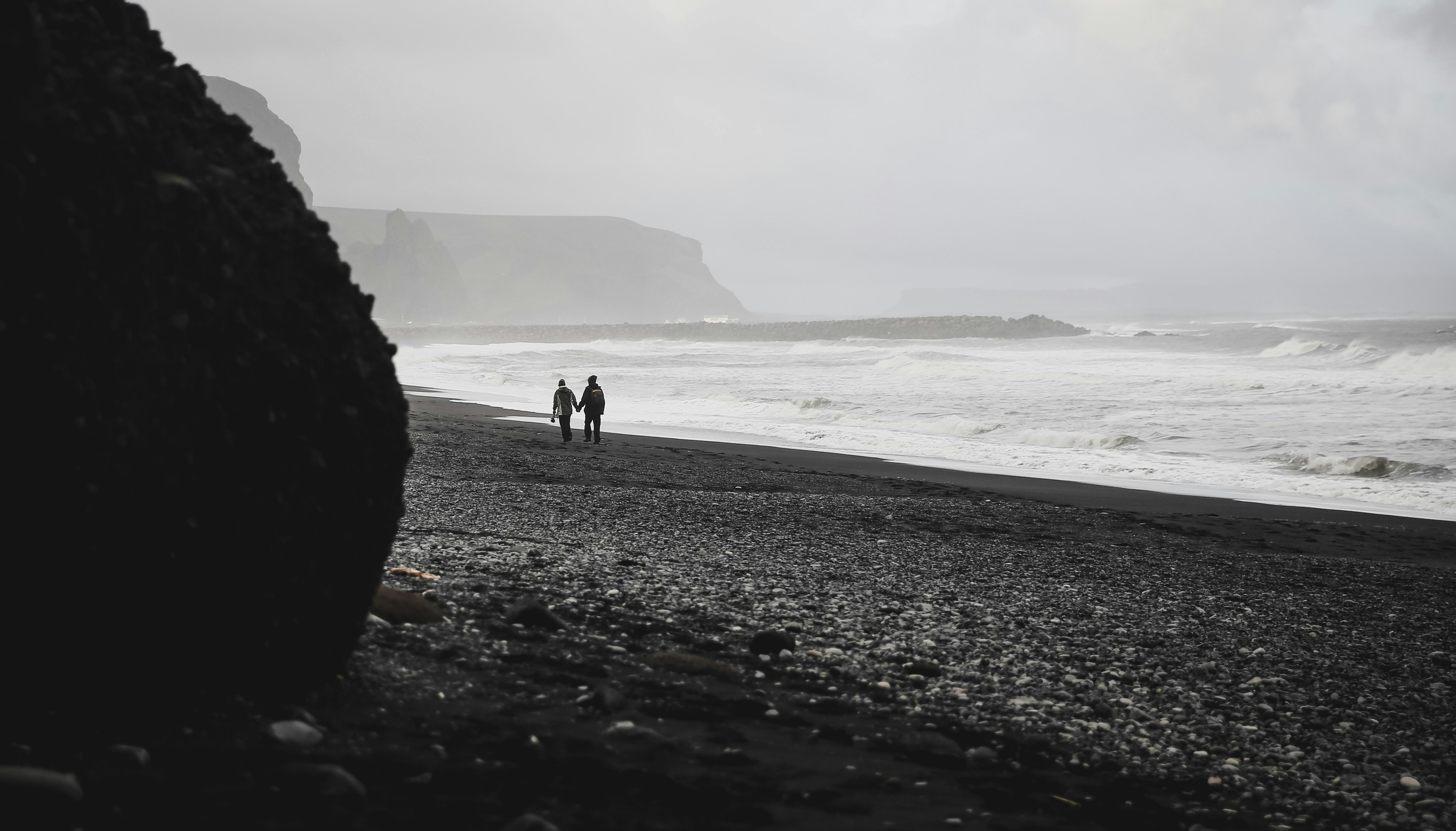 黑沙、沙灘、沙灘、夫妻、人、散步、散步、海濱、海岸、海岸、海岸線、懸崖、懸崖、懸崖、陰云、黑白、單色、深色、潮汐、巖石、地平線
