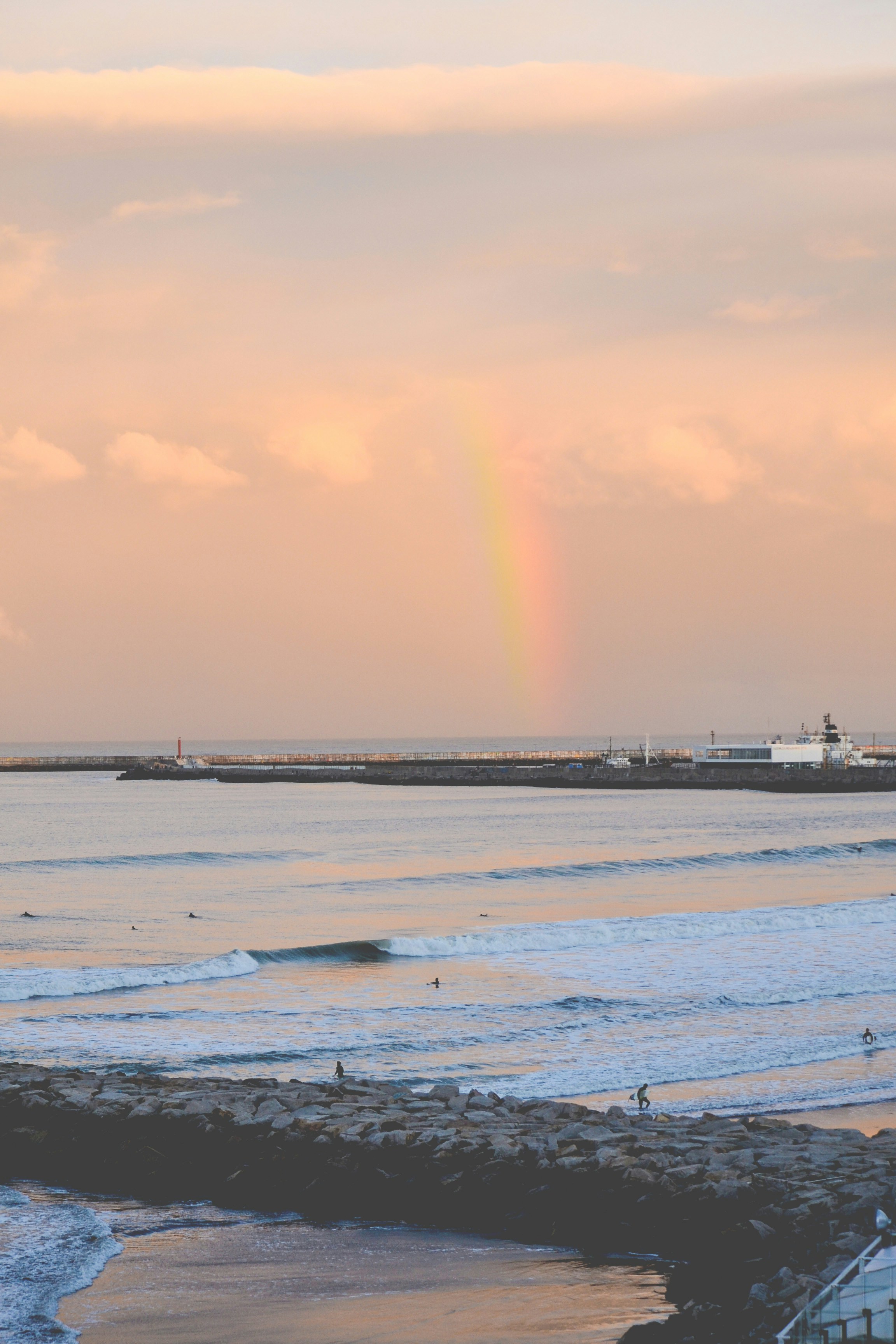 海洋、波浪、人行道、陰天、彩虹、橙色、巖石、石頭、人、天空、碼頭、大海