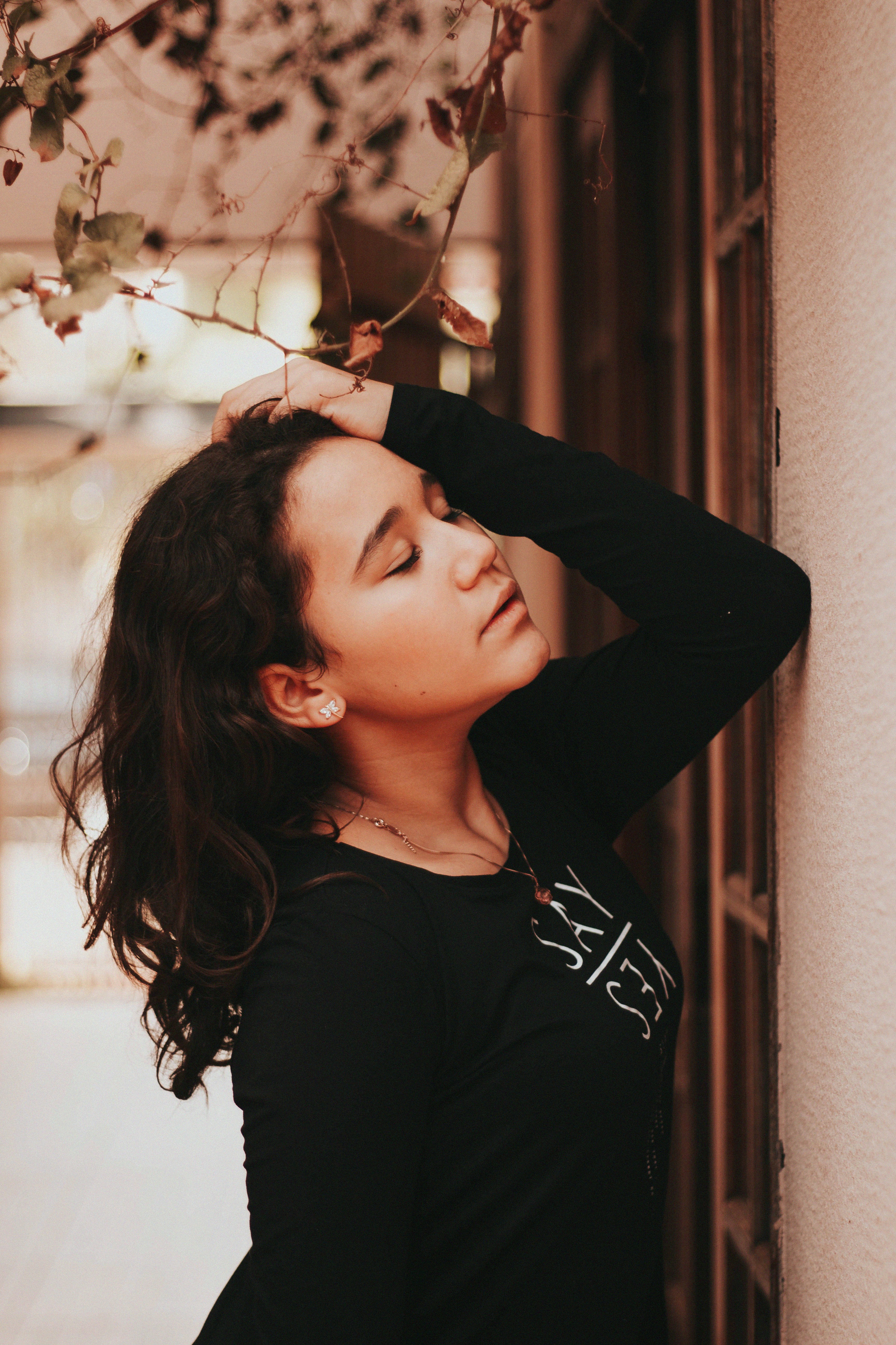 女人,閉眼,肖像,女人,黑發(fā),白種人,耳環(huán),肘,墻,城市,人,臉,攝影,女孩,植物