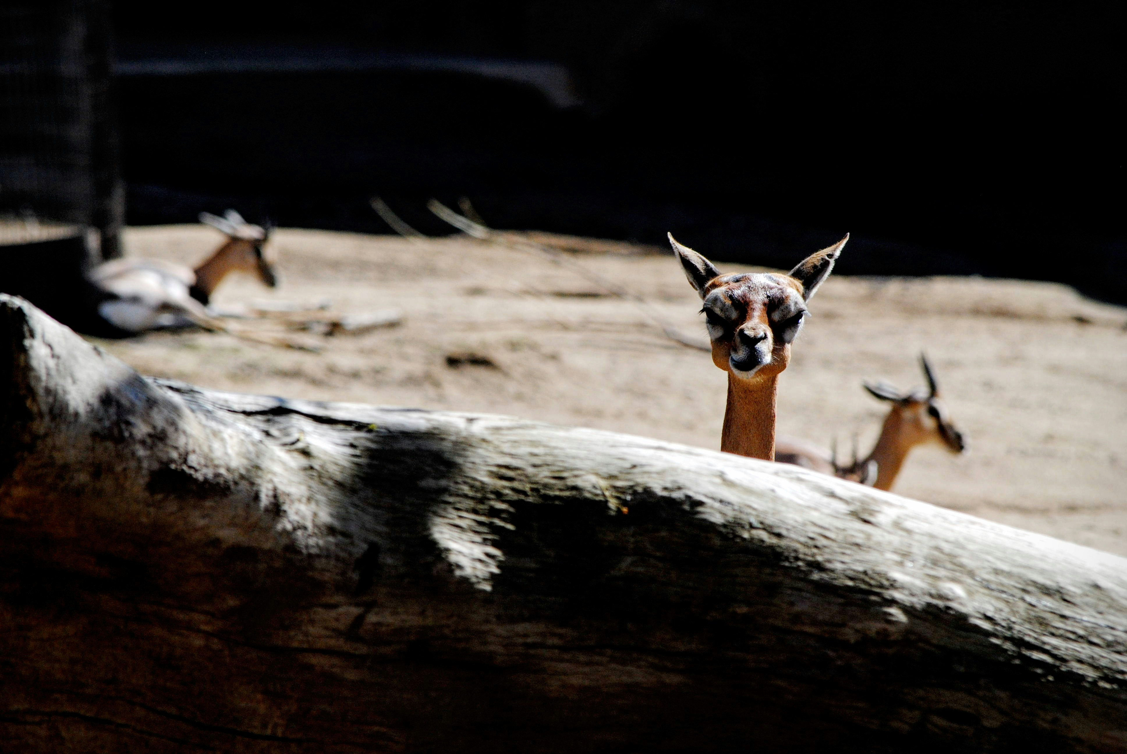 駱駝、動物園、林地、原木、樹木、深色、光、影、自然