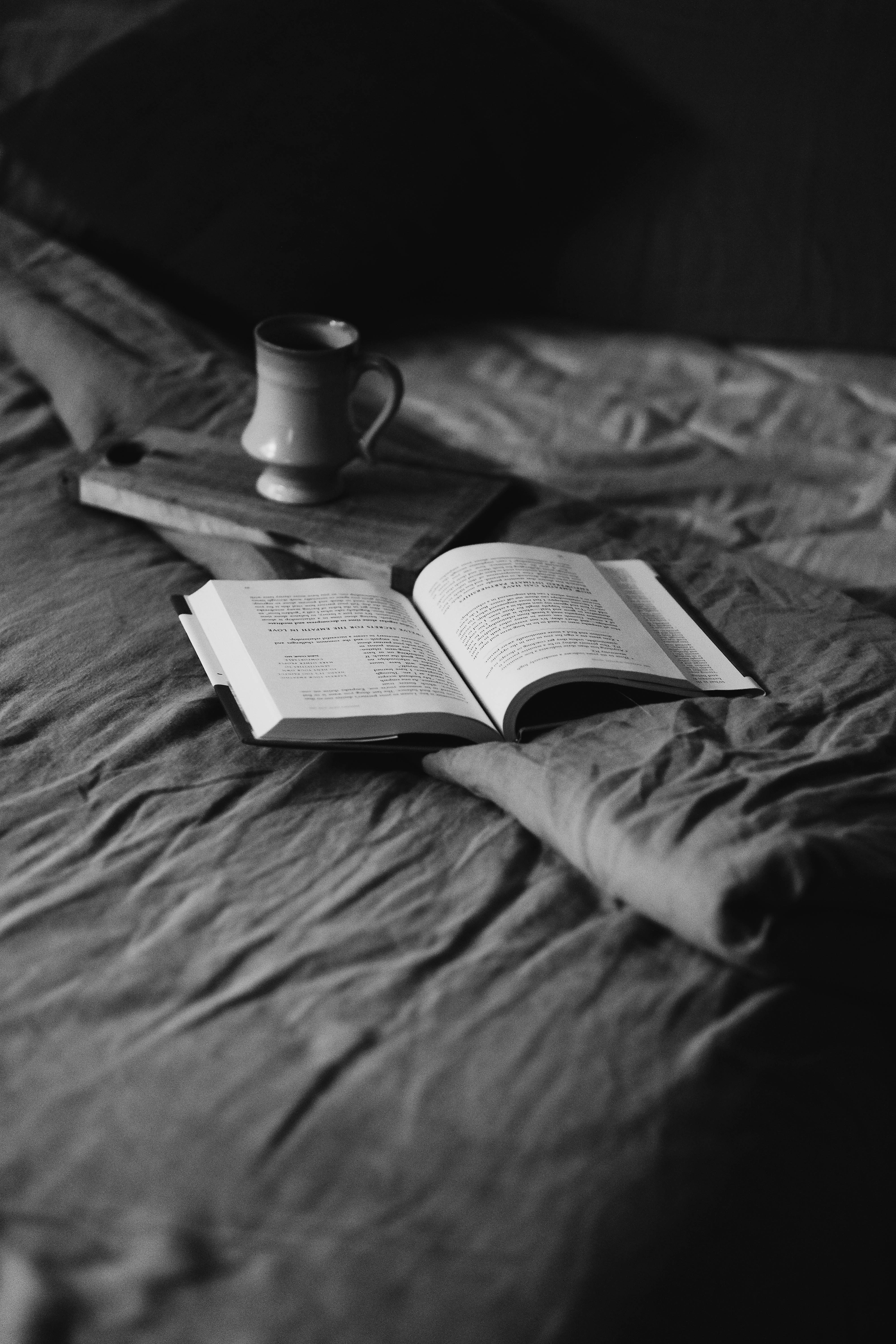杯子,茶杯,床,咖啡,茶,木托盤,打開的書,床單,閱讀,文學(xué),黑白,風(fēng)格,早晨