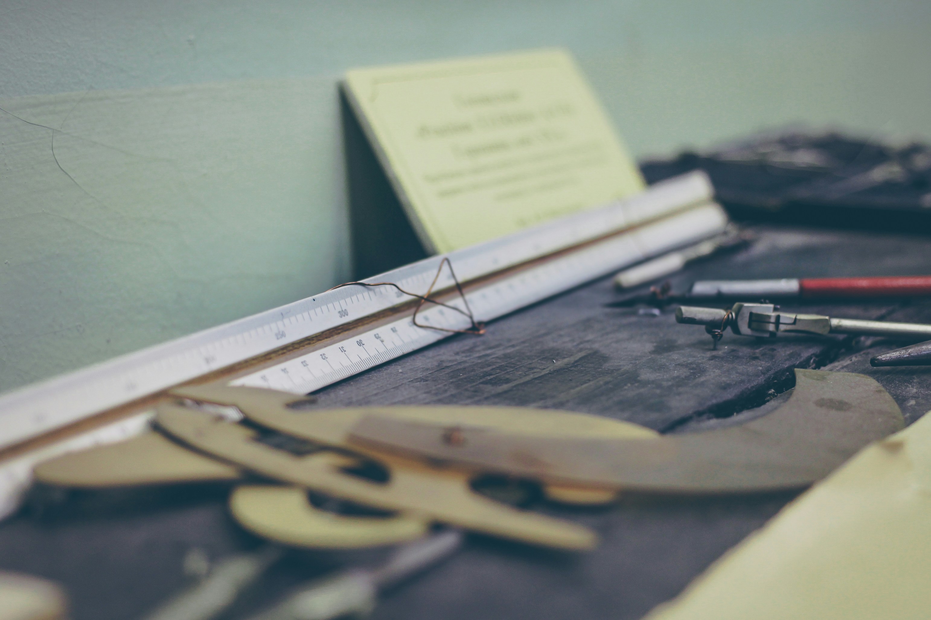 亂七八糟的工作空間有直尺、伸縮器、鉛筆