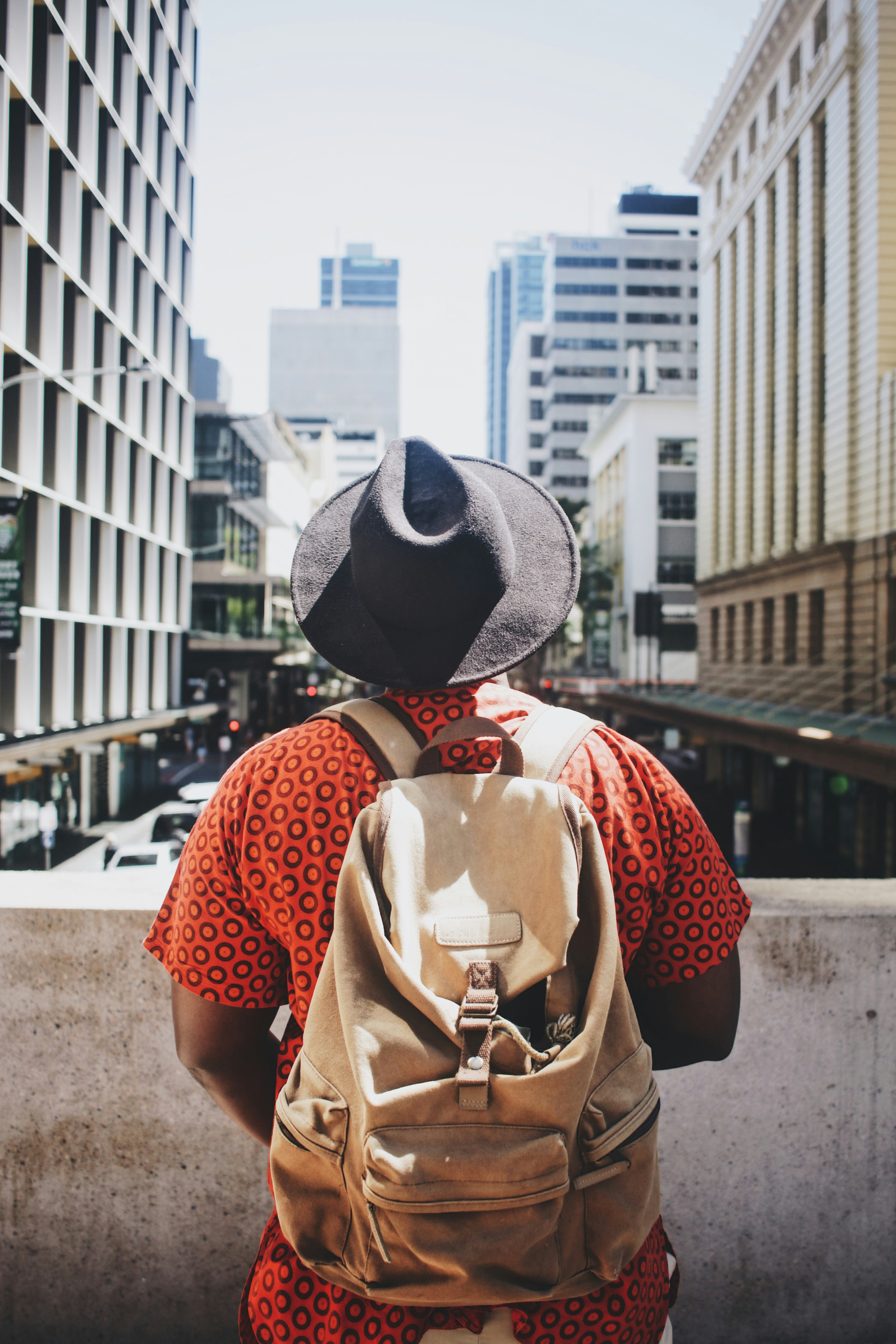 一位身穿亮橙色襯衫、帽子和背包的男子在布里斯班市的大街上向外張望