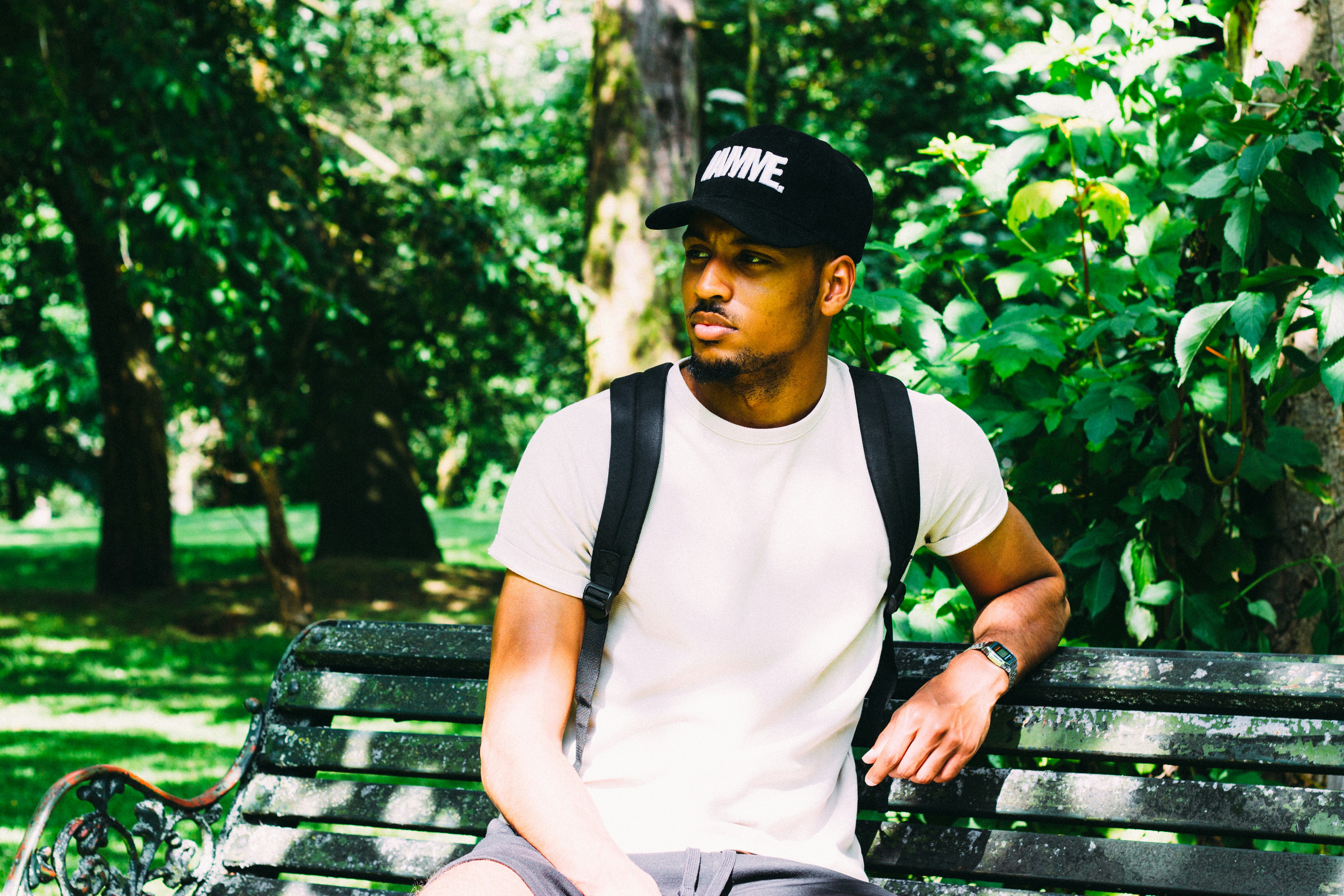 戴帽子和背包的潮流男子獨(dú)自坐在公園長椅上
