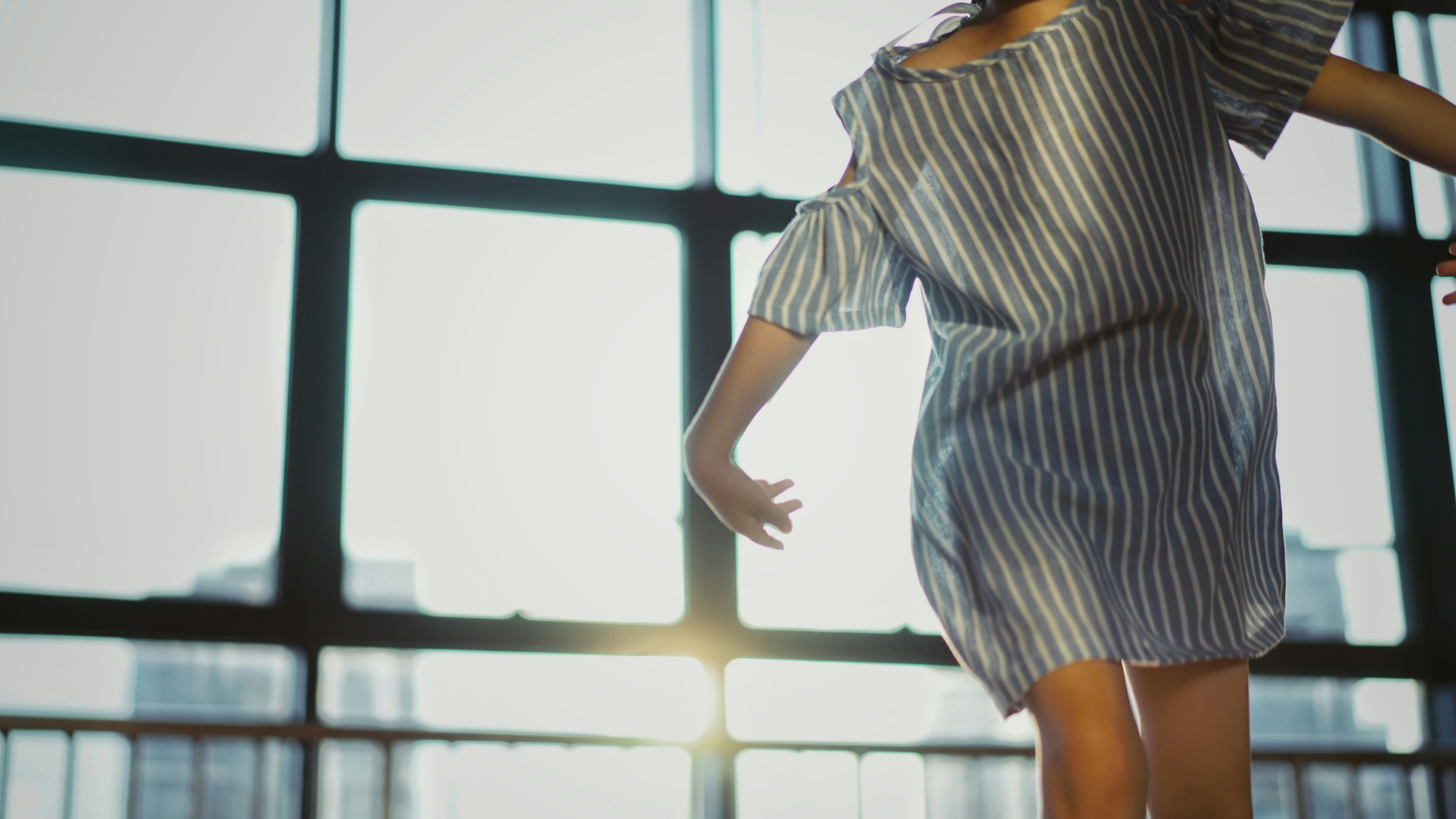 身穿條紋長袍的人在窗前跳舞