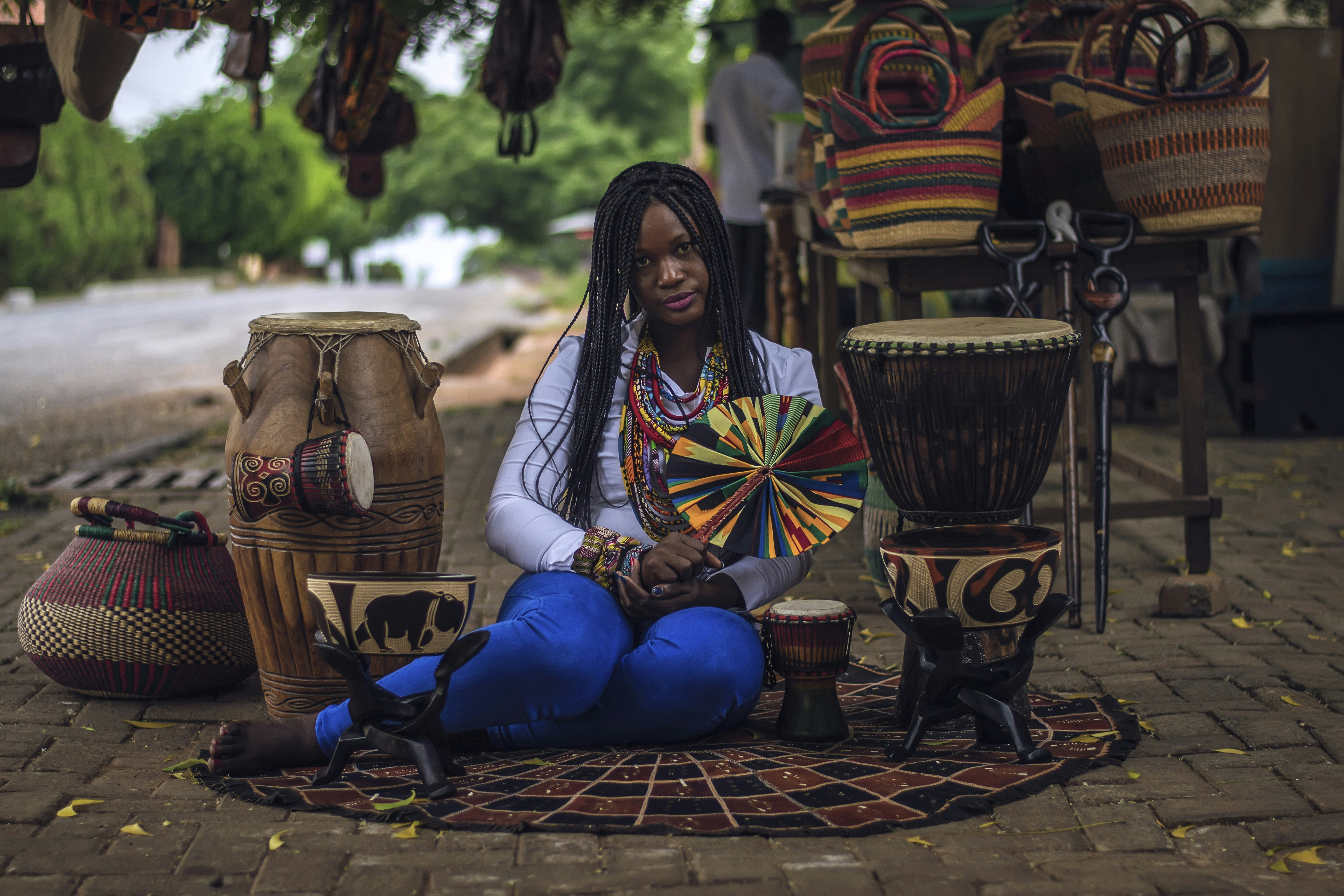 婦女,女性,非裔美國人,鼓,邦果,籃子,市場,商人,攤位,銷售,編織,袋,棍子,人行道,鵝卵石,人行道,孩子,女孩,情感,眼睛