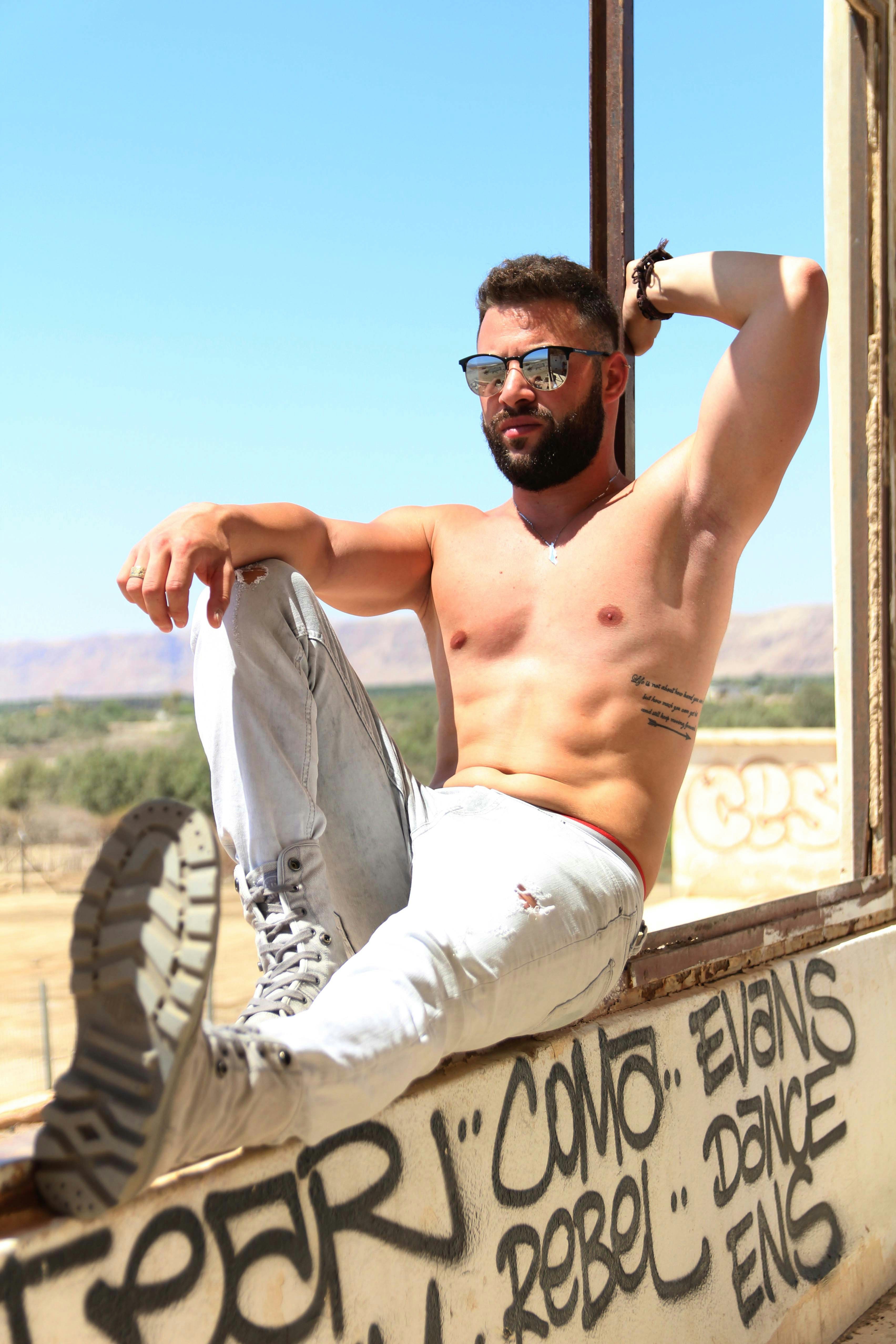 一個體貼入微的赤身裸體的男人在死海戶外的涂鴉窗框上擺姿勢。