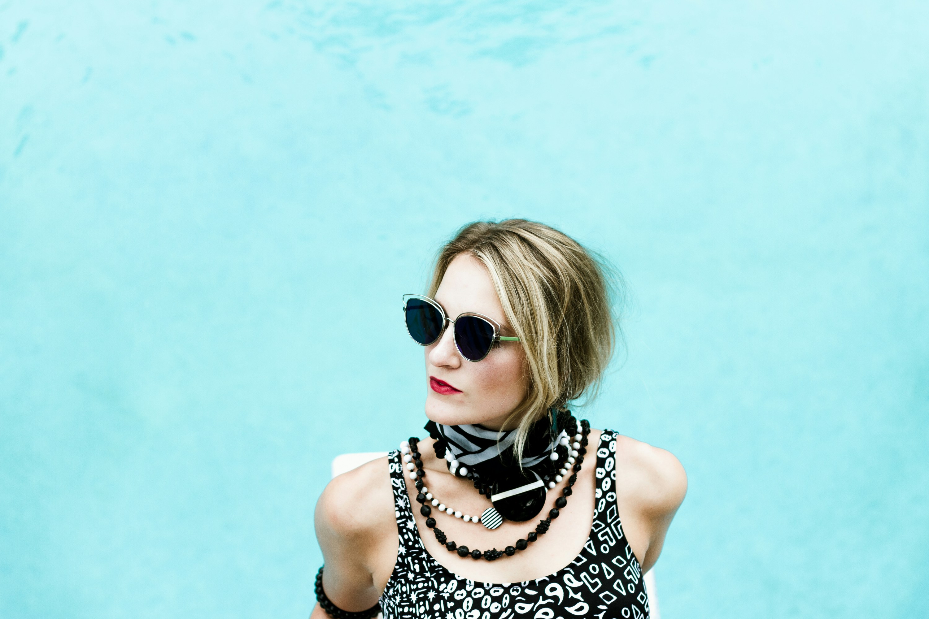 女人,女人,太陽(yáng)鏡,項(xiàng)鏈,圍巾,金發(fā),水,游泳池,躺下,放松,夏天,泳池,泳池,泳池
