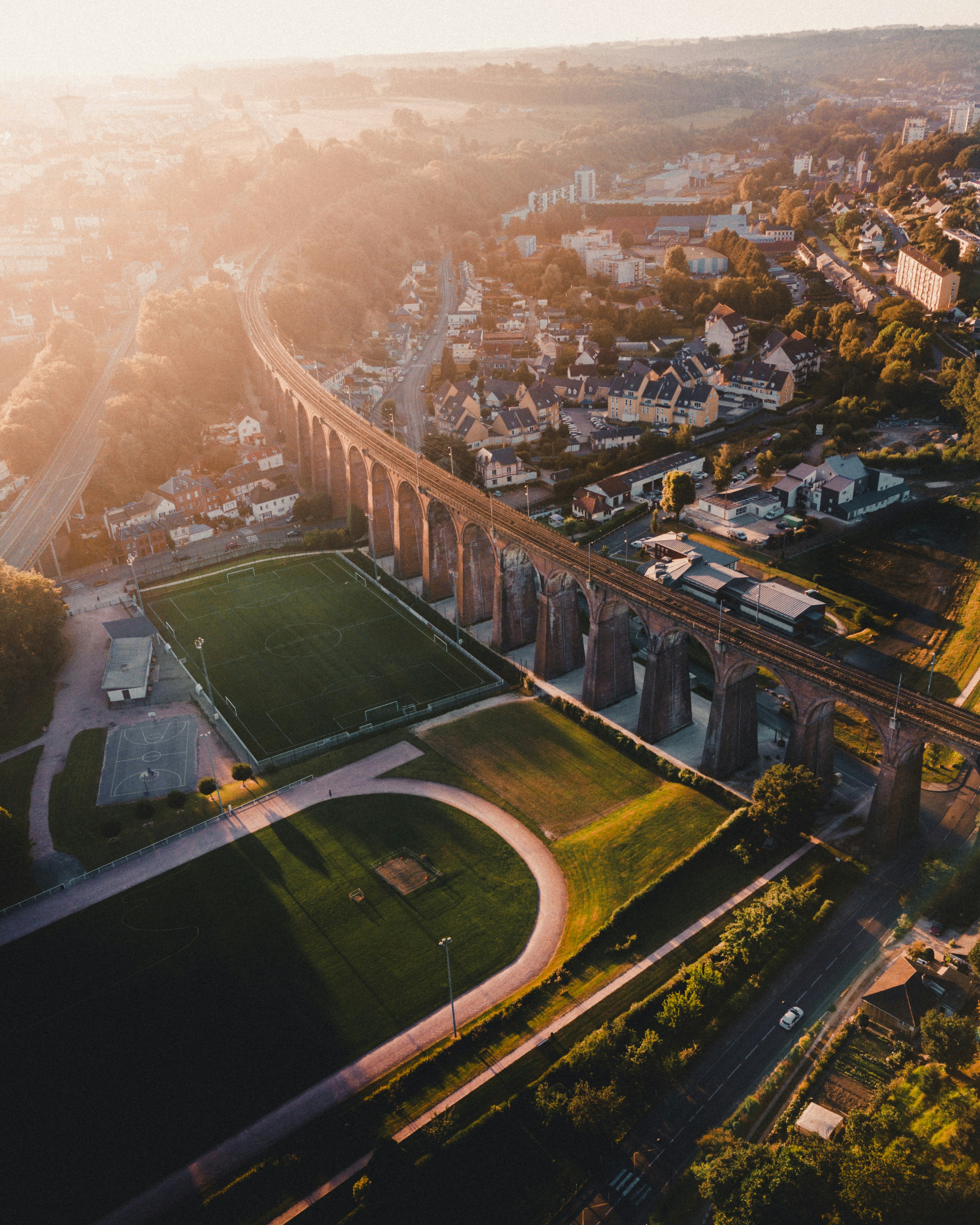 拱門,城市,足球場,足球場,球場,草地,公園,無人機視圖,火炬,太陽,日出,日落,輝光,高架橋,無人機