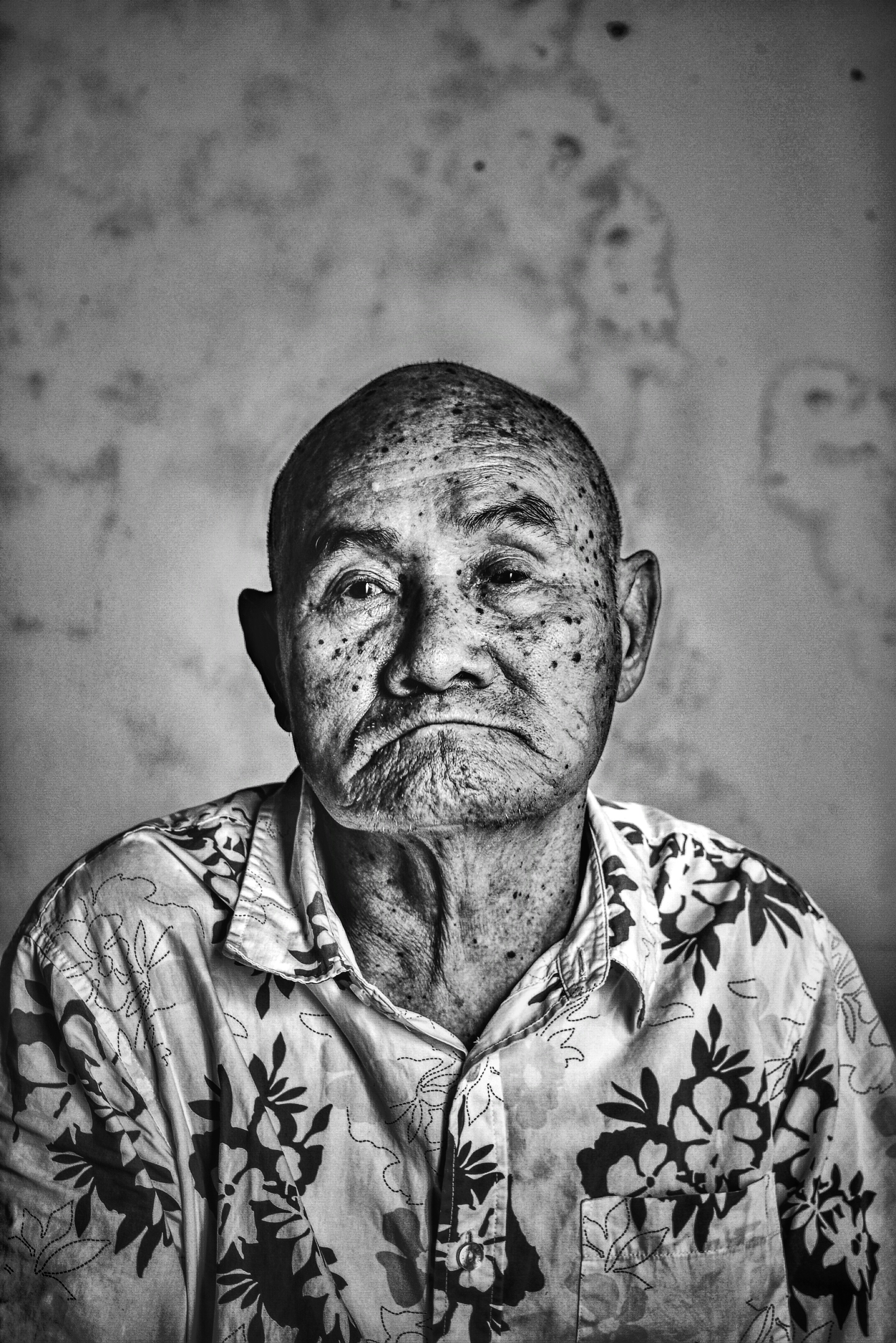 黑白相間的戴著花式夏威夷襯衫的禿頂老人