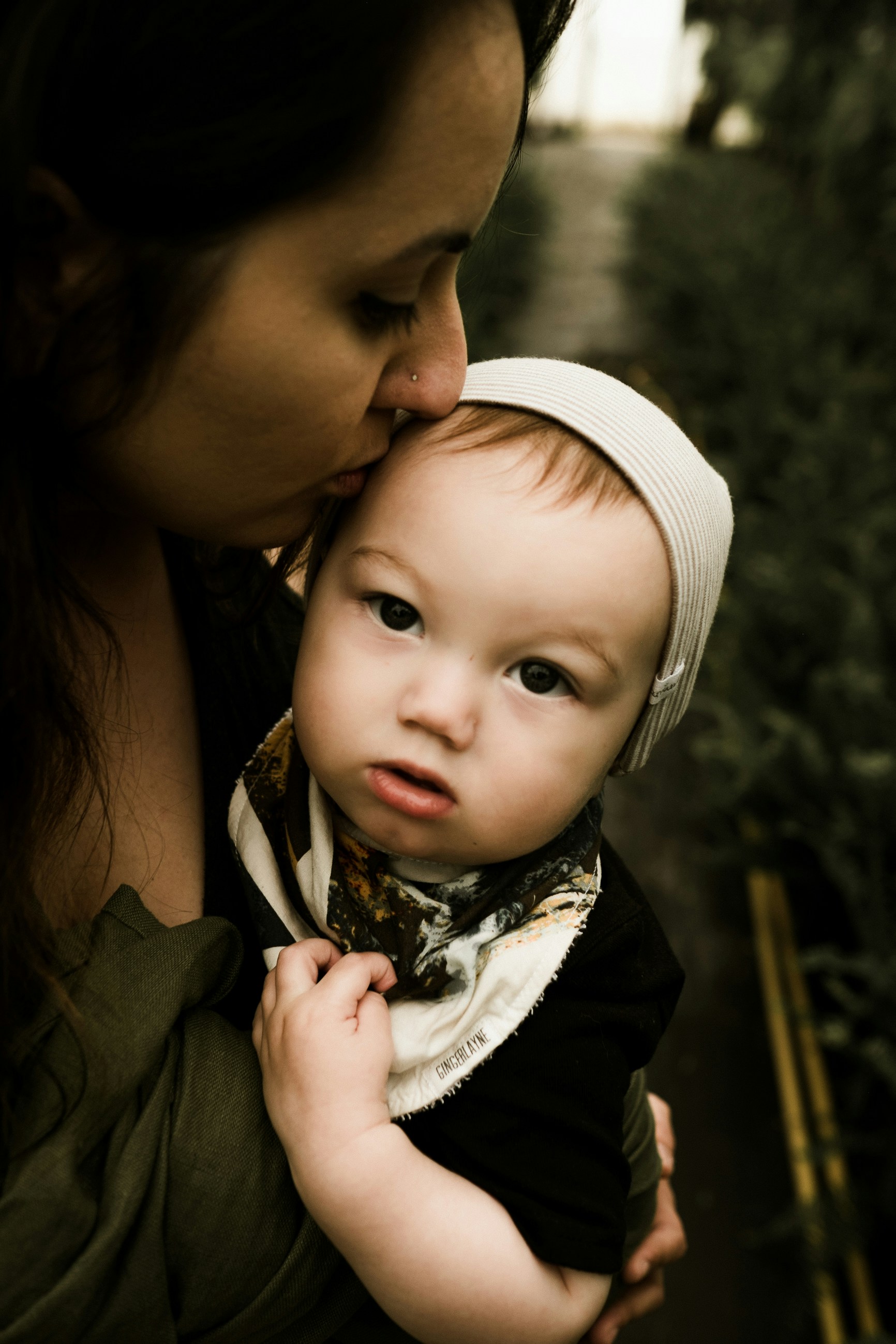 woman,female]mother,child,boy,male,kissing,glasses,portrait,family,grass,garden,home,tree,fence,girl,son,mother,cute,love,kiss