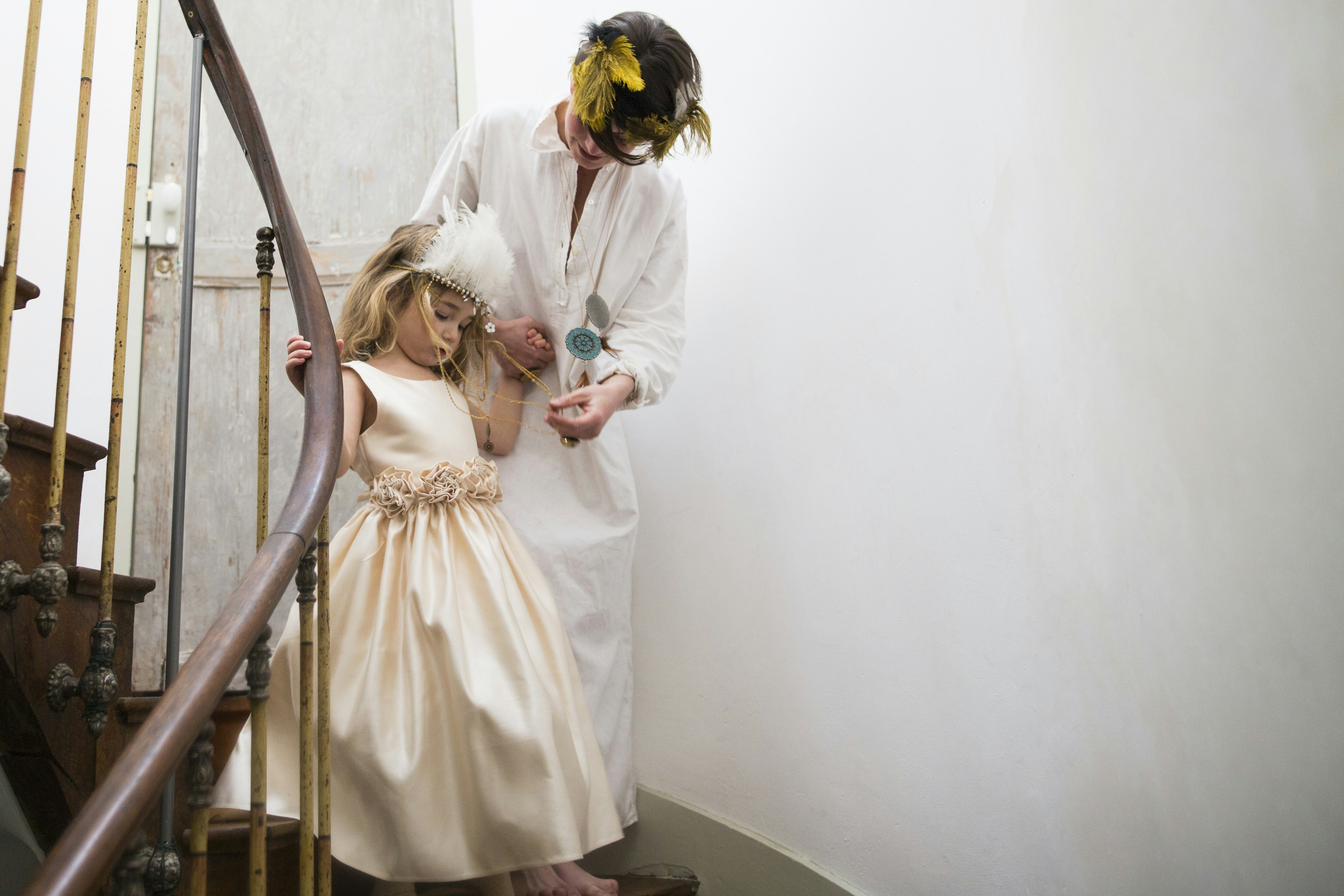 Mother and daughter dressed elegantly in white descending a turn in a staircase.