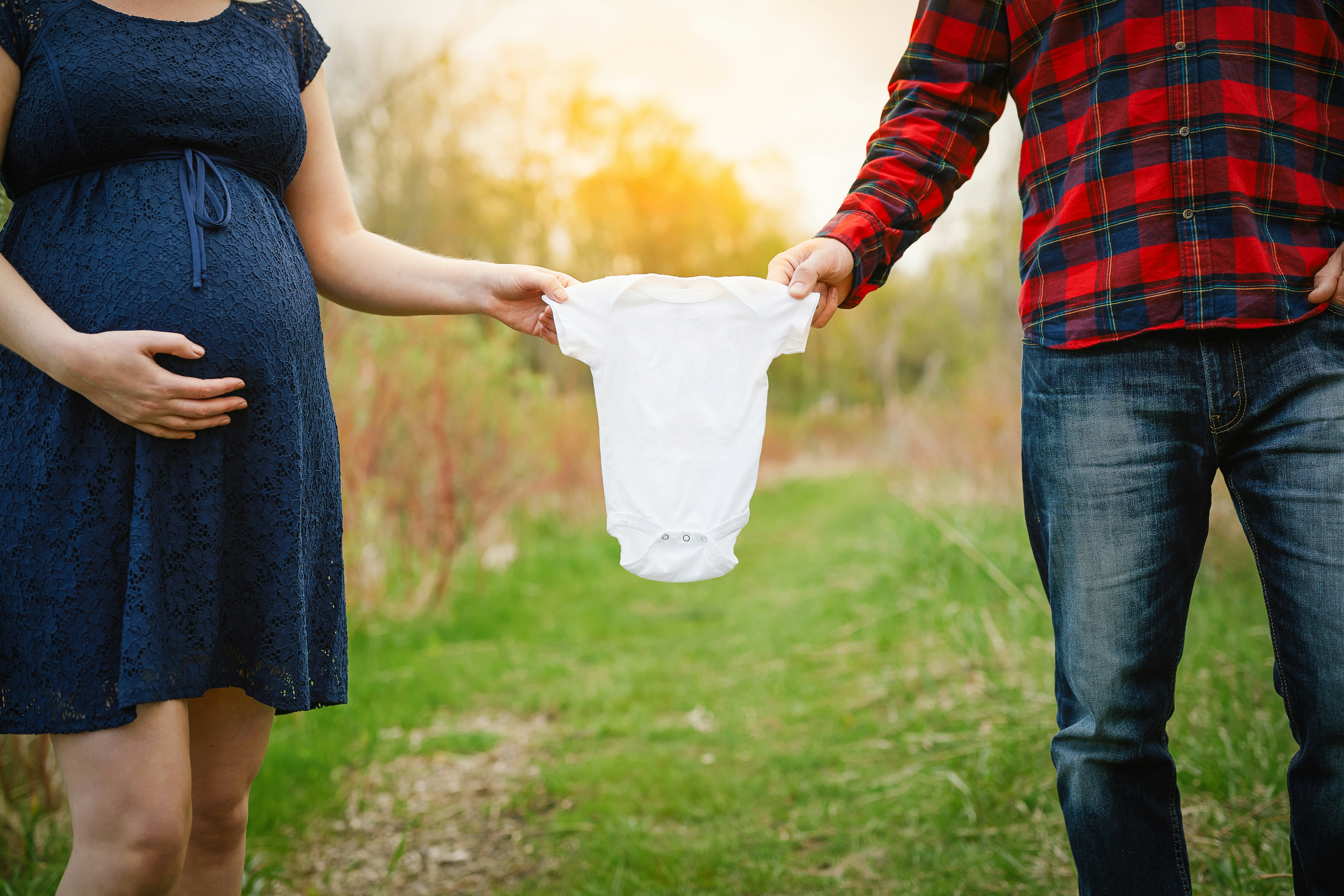 孕婦和男人在戶外舉起白色嬰兒服裝