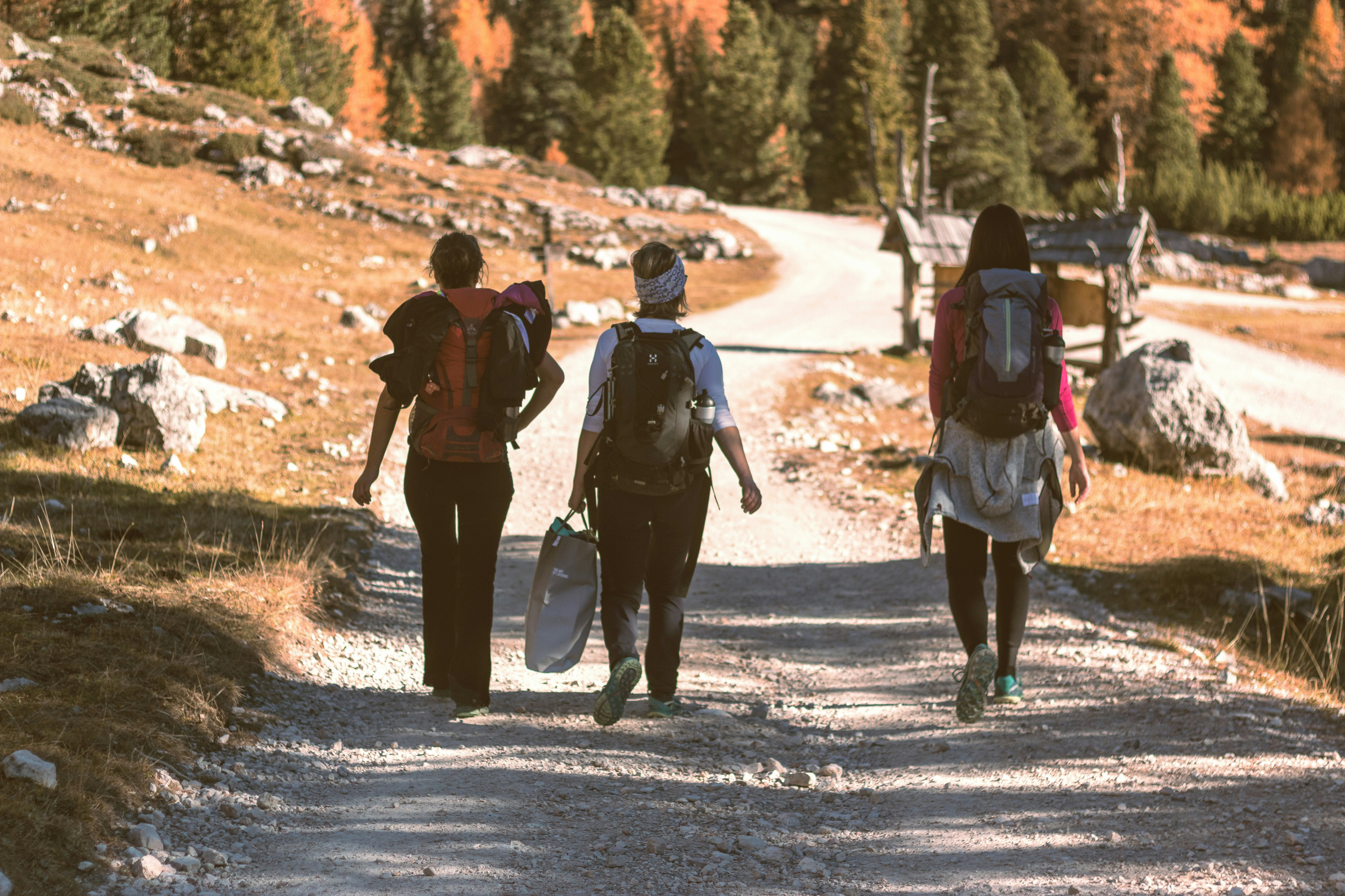 女人,女人,背包,朋友,足跡,小道,巖石,boulder,井,籬笆,樹,森林,女孩,自然,散步,散步,秋天