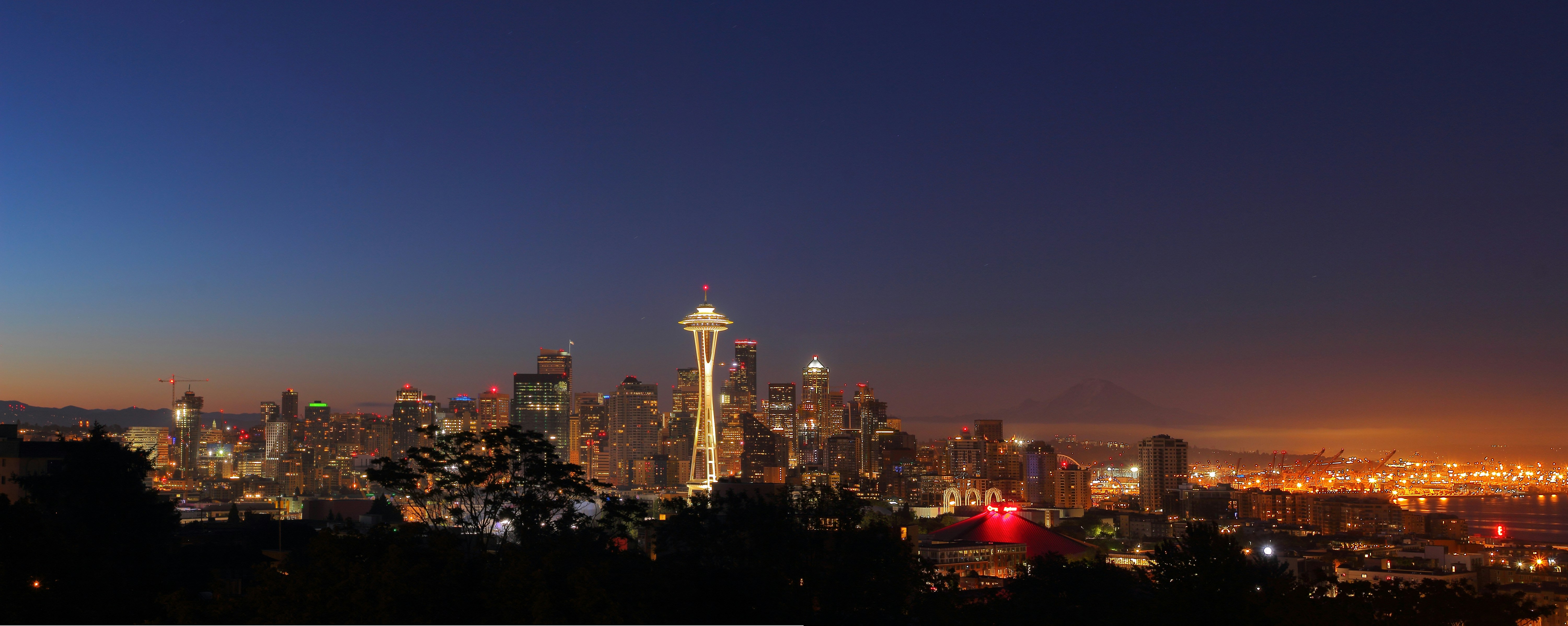 太空針、城市景觀、天際線、西雅圖、城市、城市、地平線、全景、全景、山篷、摩天大樓、城市燈、建筑物、日出、夜晚、日落、天空、黑暗、標志、地標