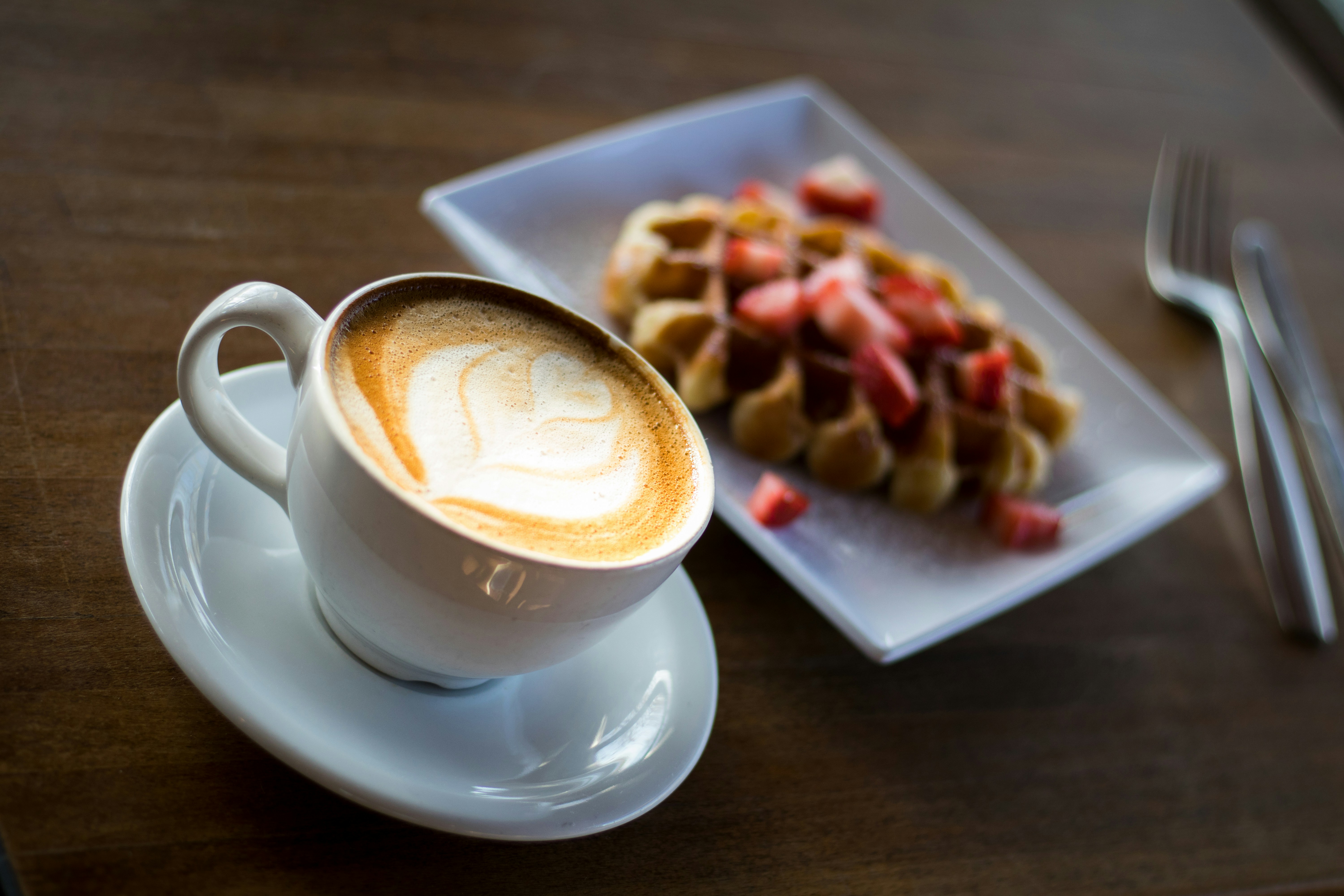 cake,cup & saucer,latte art,snack,pastry,fruit,sugar,treat,cafe,restaurant,eat,food,cutlery,plate,kaffee meister,strawberry,waffle,espresso,cappuccino,brunch