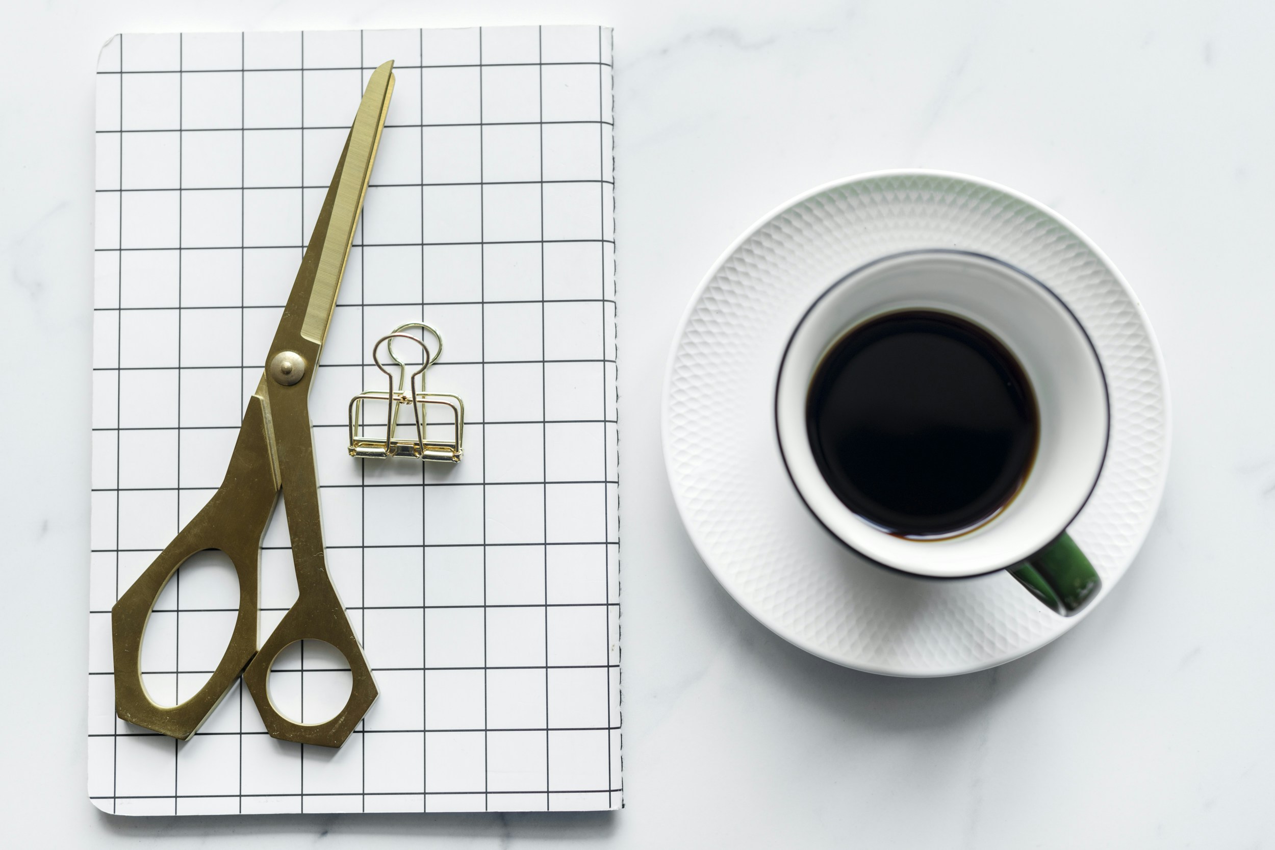 最小,剪刀,筆記本,平鋪,工作空間,工作,工具,桌子,筆記本,大理石,雜志,金子,平鋪,編輯,創(chuàng)意,黑咖啡,美式咖啡,從上面,夾子,杯子