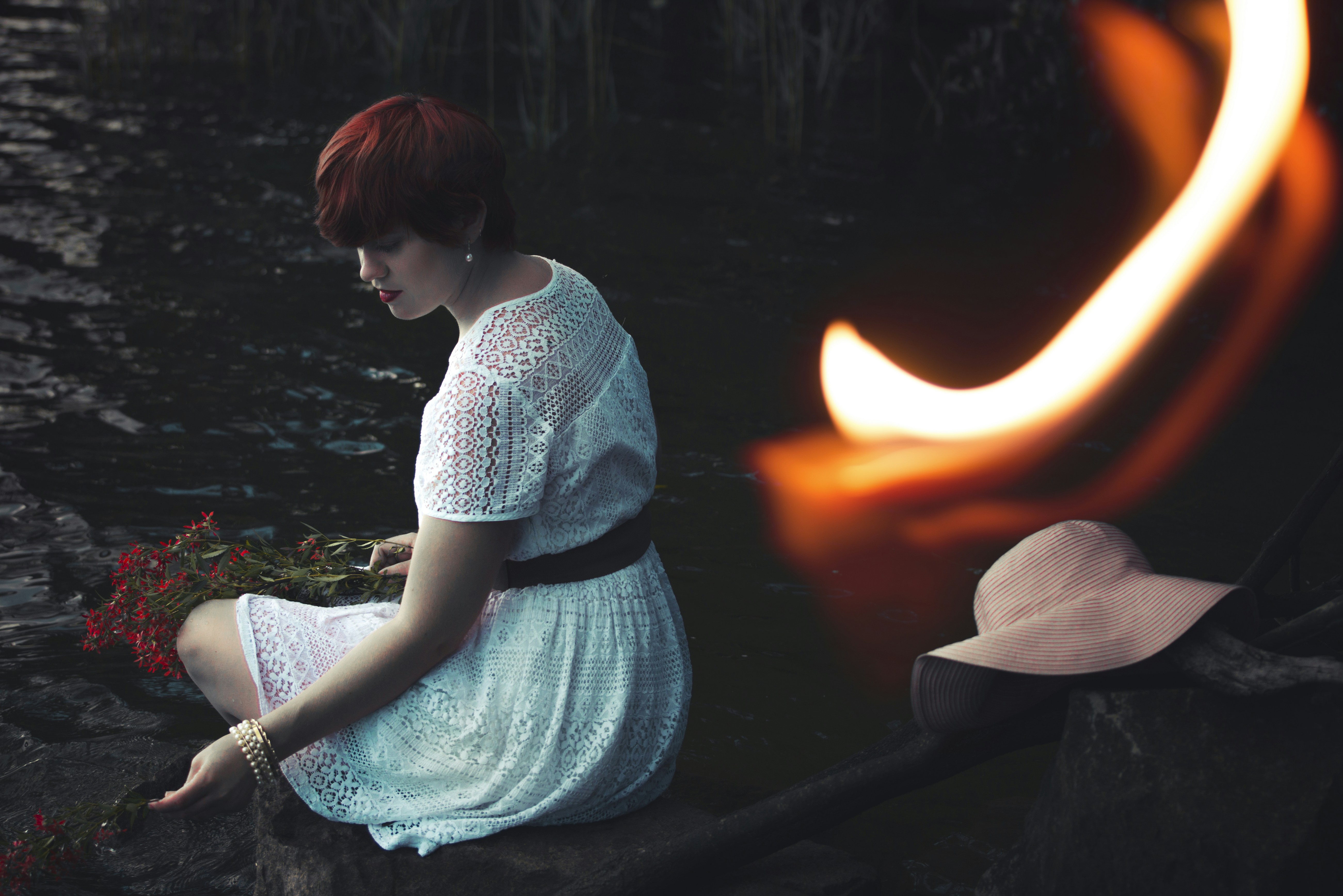 女人、女人、衣服、肖像、模特、鮮花、帽子、瓦片、海洋、水、光、美麗、白色、時(shí)尚、色彩、藝術(shù)、藝術(shù)、可愛(ài)、紅發(fā)、紅色。
