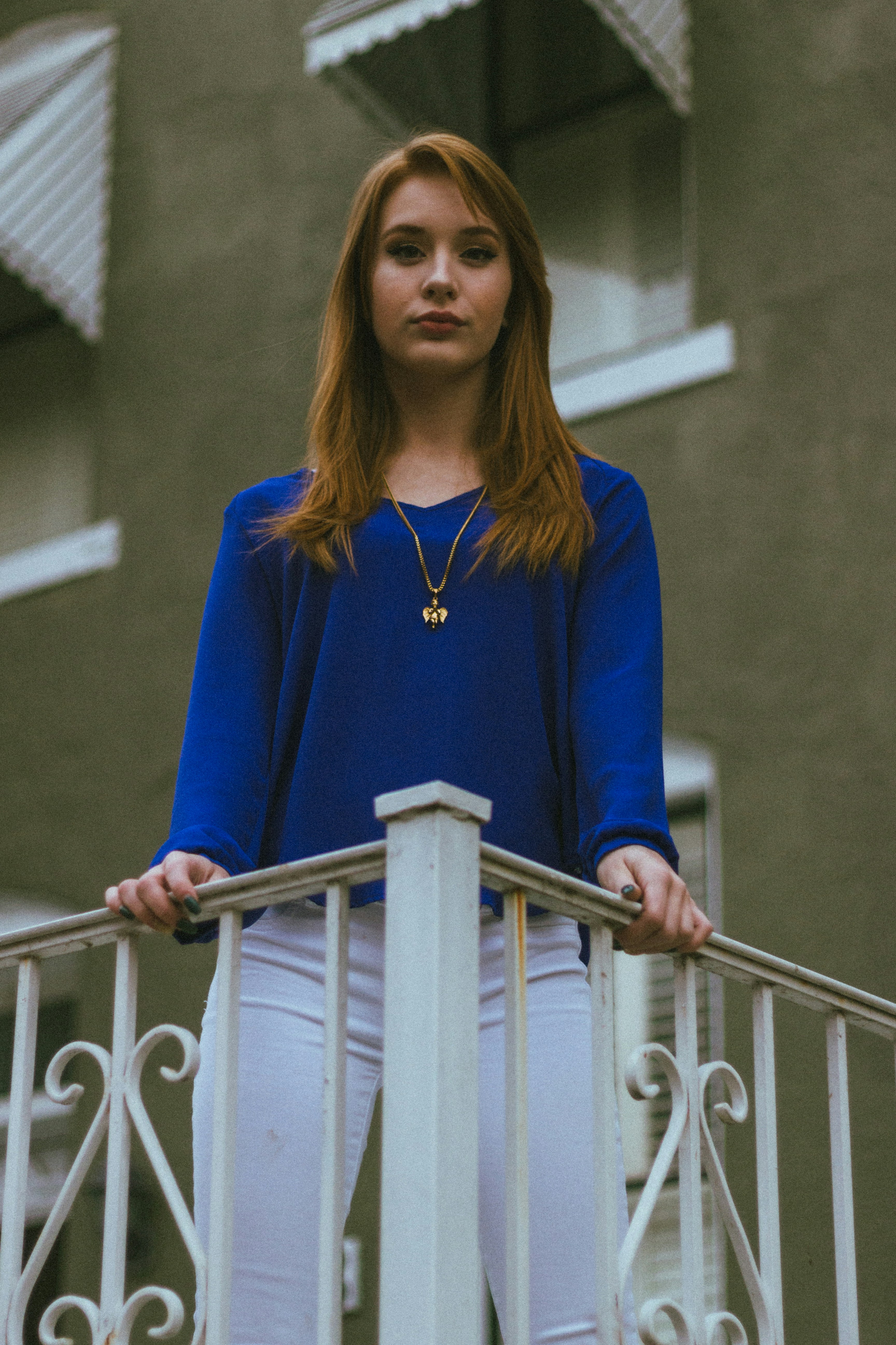 女人,女人,衣服,藍(lán)色,肖像,模型,陽(yáng)臺(tái),圍欄,城市,女性模型,模特,青少年,紅頭,紅色,紅頭,項(xiàng)鏈,襯衫,戶外,城市