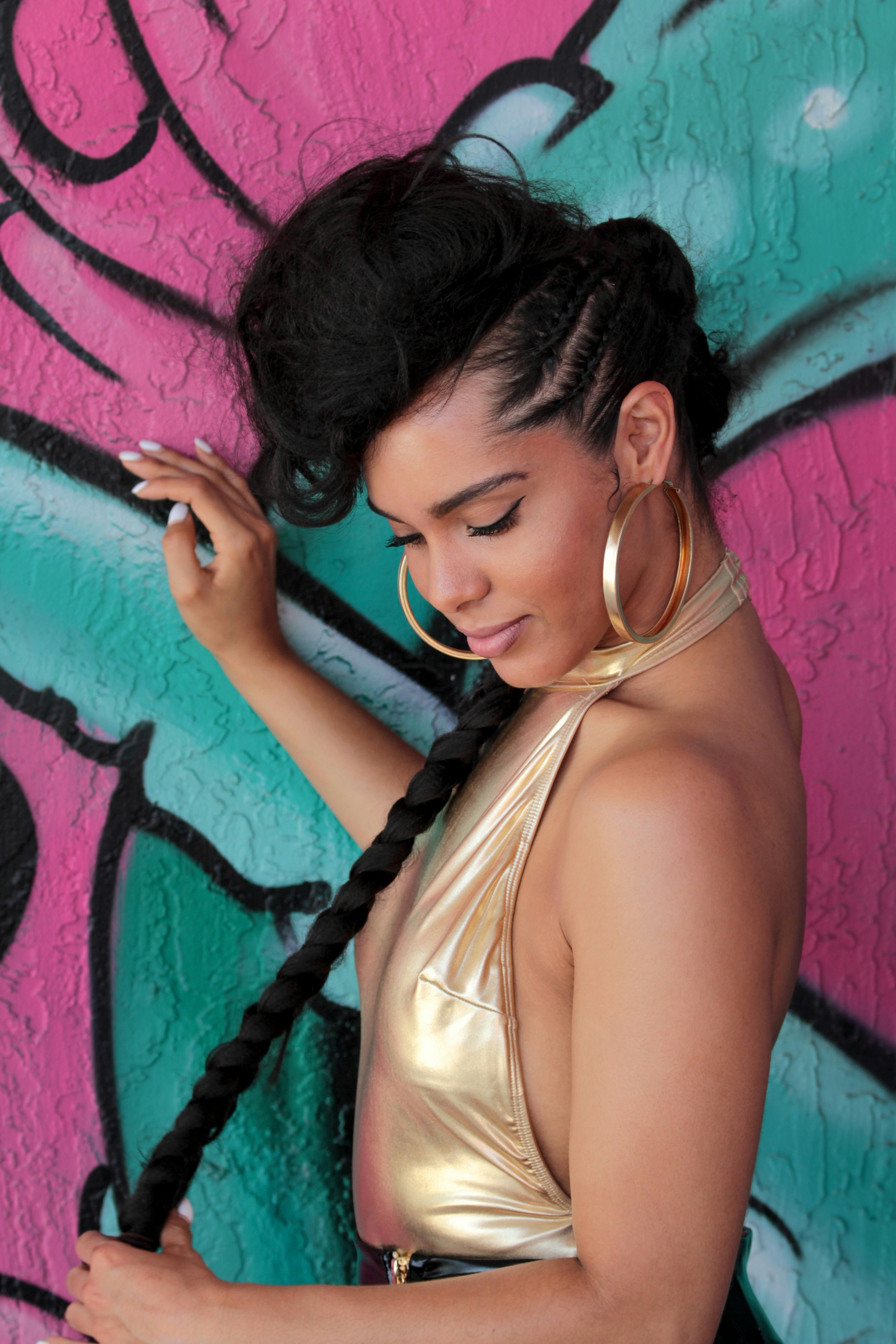 迷人的年輕女子穿著金裙和環(huán)圈擺在涂鴉街頭藝術(shù)面前