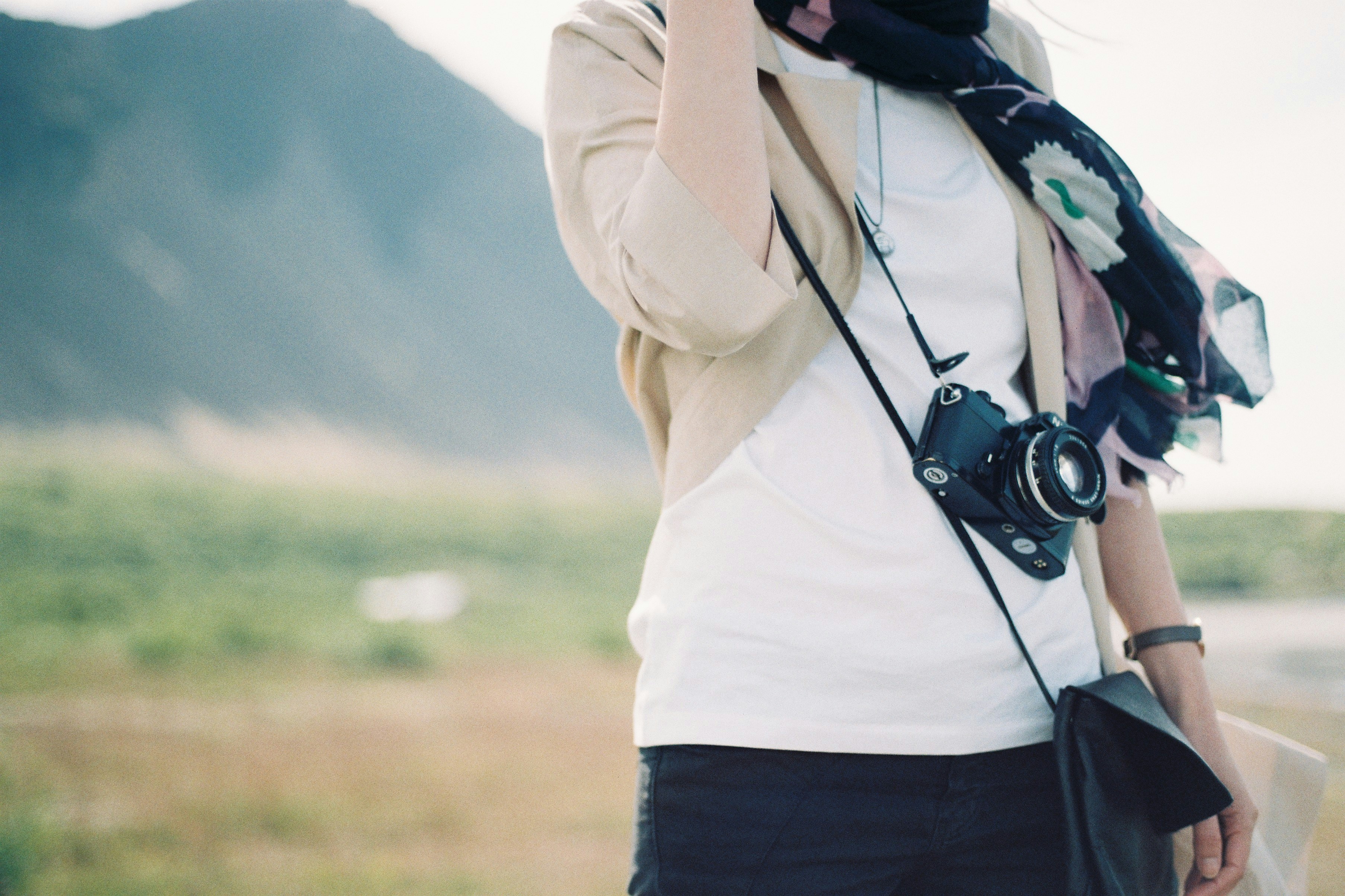 照相機(jī),攝影機(jī),照相機(jī),復(fù)古相機(jī),圍巾,女人,無臉,戶外,自然,田野,夏天,夏天