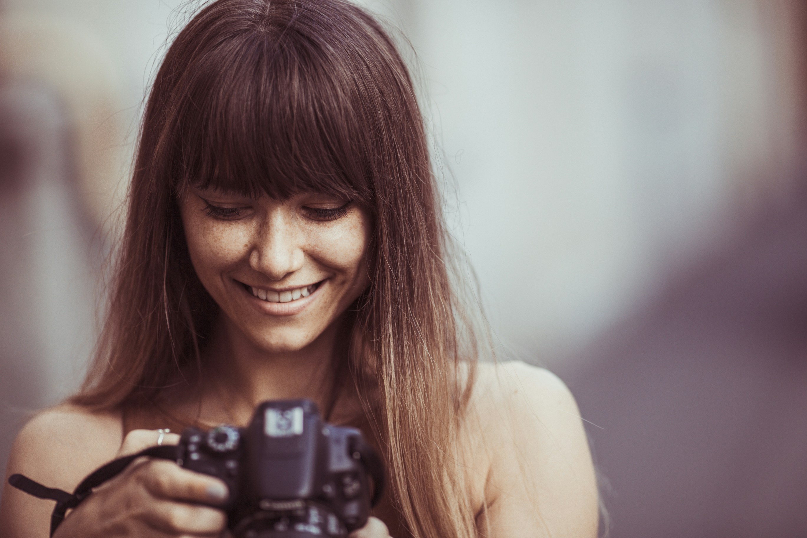 一個棕色頭發(fā)和劉海的女人對著模糊的背景微笑著對著鏡頭微笑。