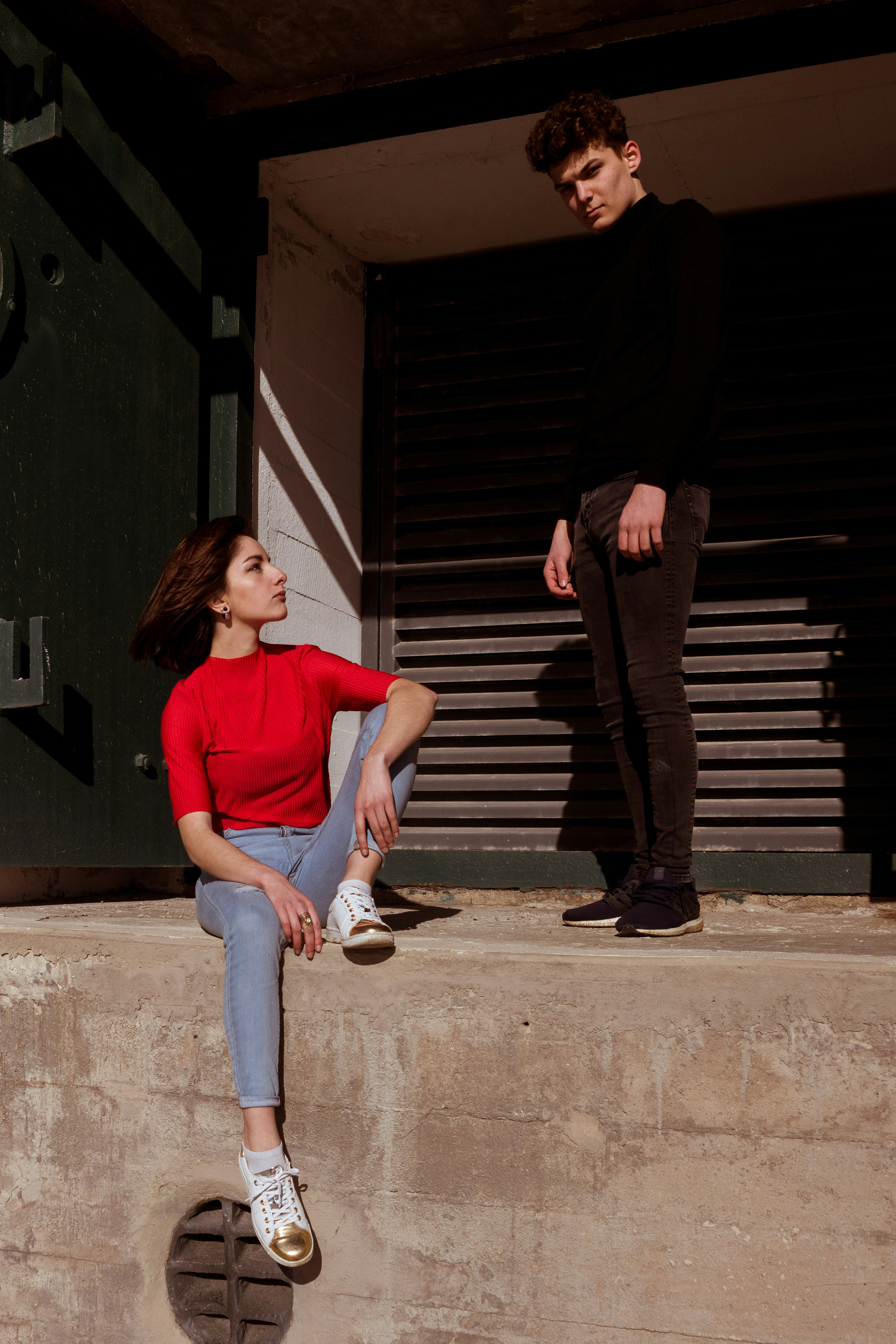 城市、街道、情侶、人、男人、女人、坐、站立、輪廓、二、混凝土、金屬、壁龕、模型、凝視、手、時尚