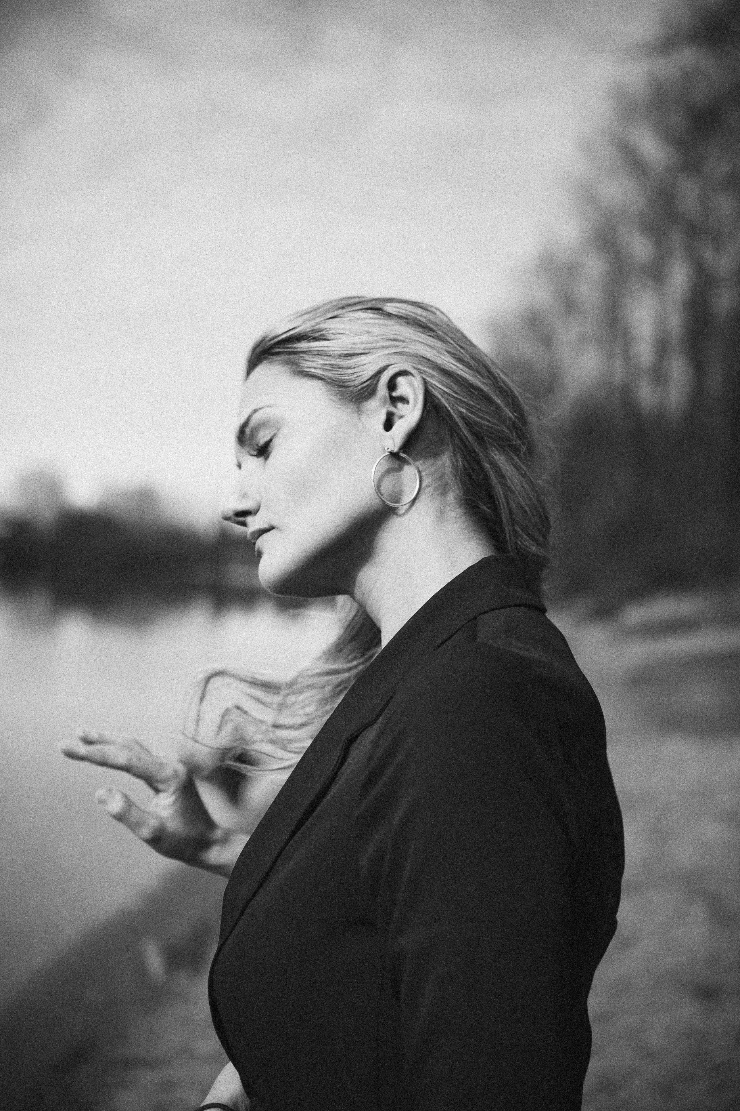 人,肖像,向下看,閉上眼睛,戶外,湖泊,女孩,女人,黑白,輪廓,單色,女性,女士,金發(fā),長發(fā),環(huán)形耳環(huán),襯衫,停止,等待,看