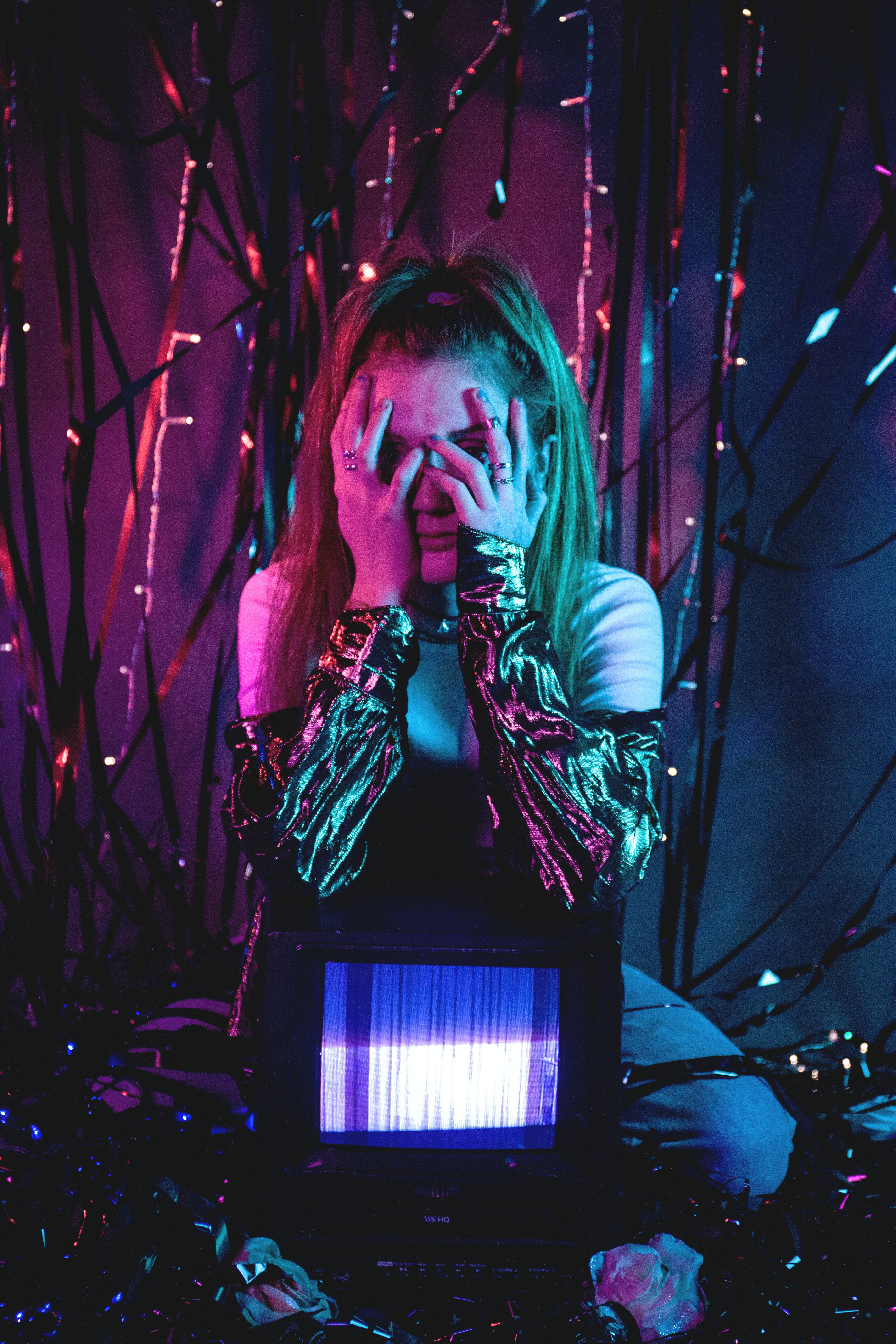 夜晚,黑暗,燈光,粉色,藍(lán)色,女人,女人,女孩,仙女燈,電視,銀幕,監(jiān)視器,臉,模特,肖像,時(shí)尚,年輕,80,年份,創(chuàng)意