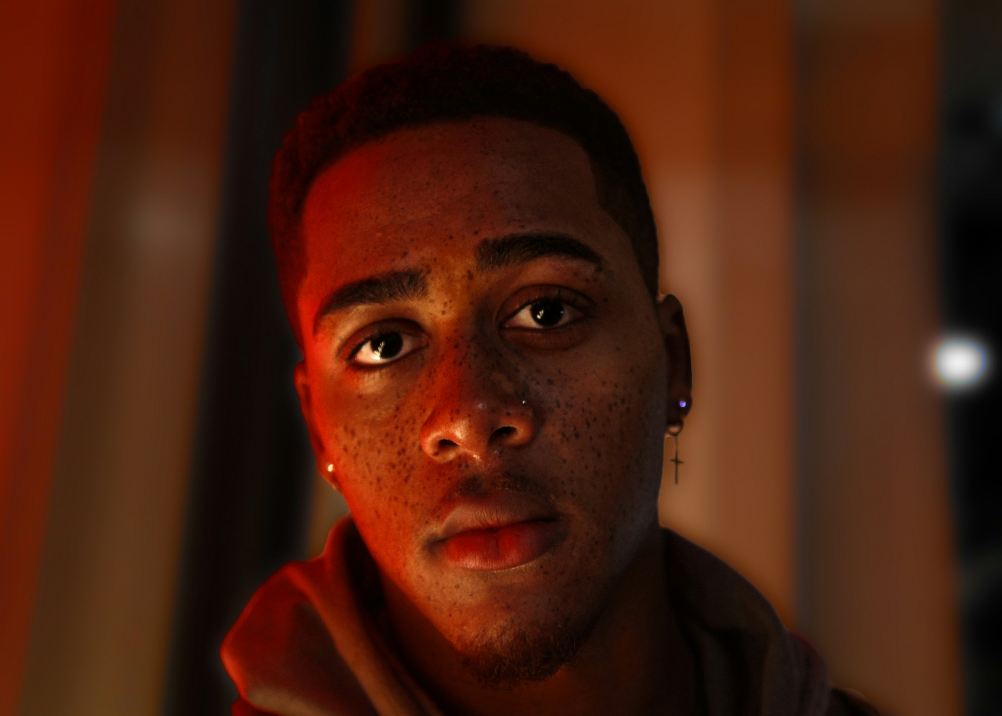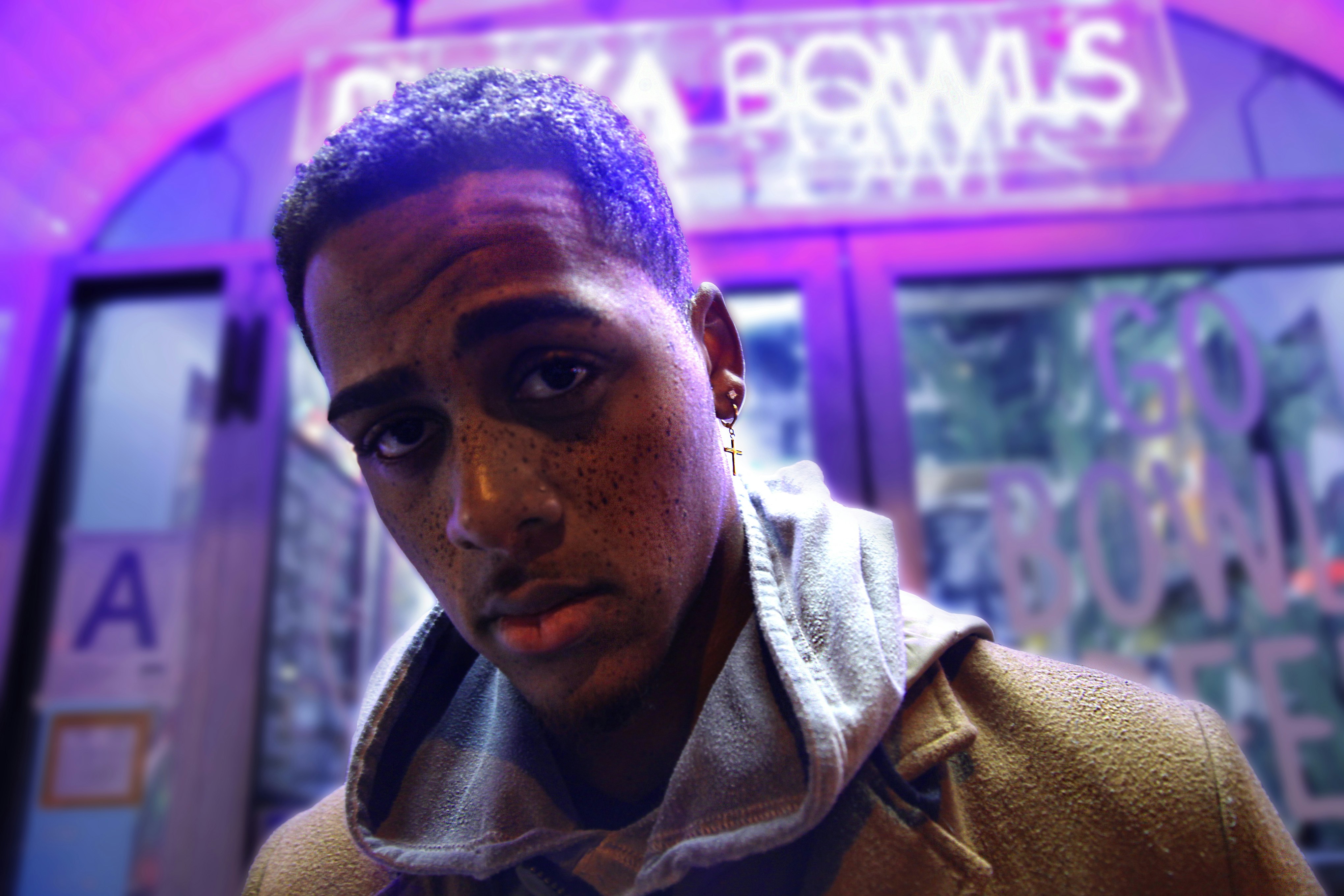 男人,男性,肖像,模型,窗戶(hù),建筑,標(biāo)志,城市,時(shí)尚,連帽衫,粉紅色,霓虹燈,非洲裔美國(guó)人,紫色燈光,特寫(xiě),夜景,雀斑,眼睛,耳環(huán)
