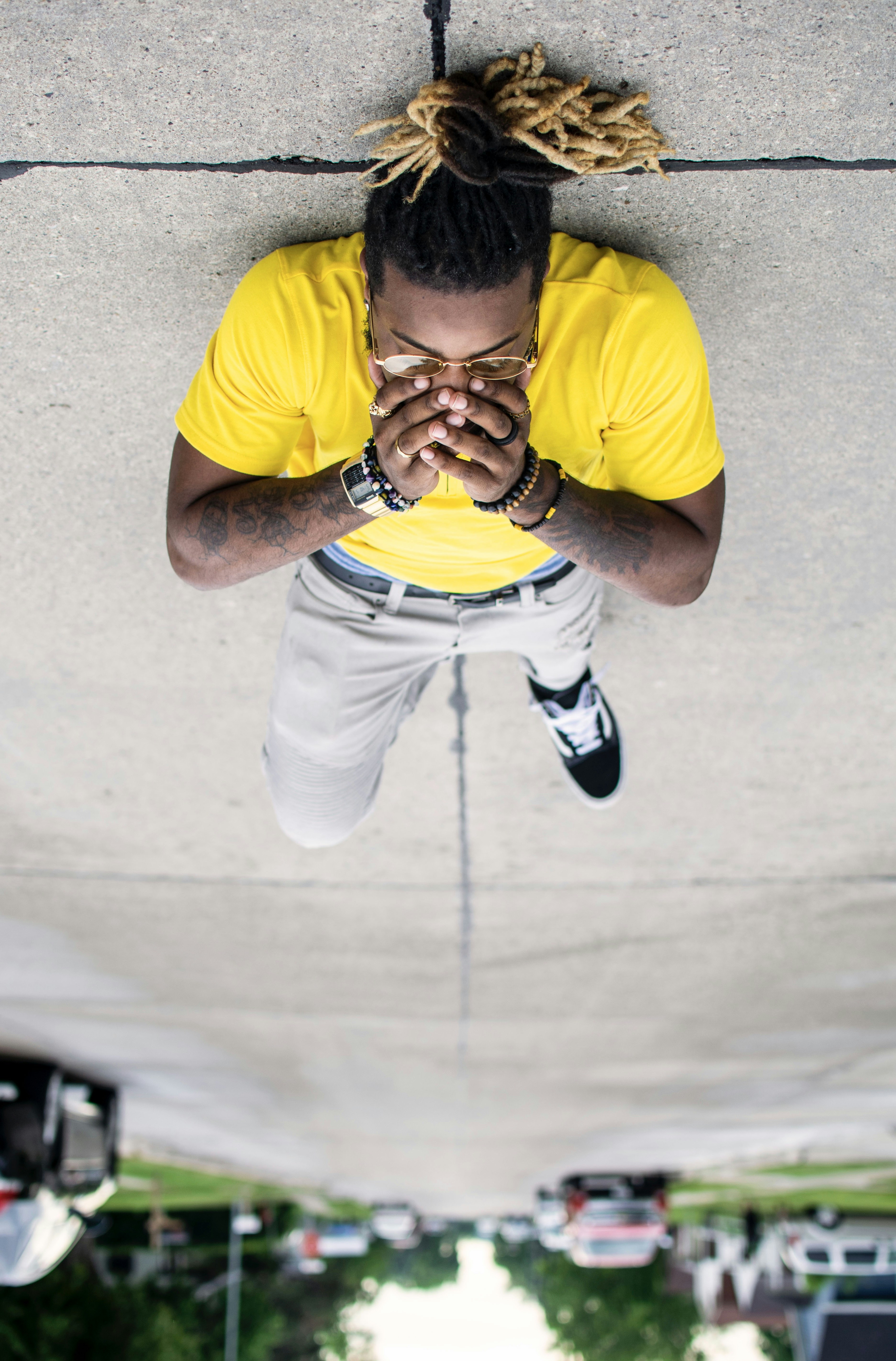 男人,男人,畫(huà)像,黃色,眼鏡,地面,顛倒,疲憊,街道,襯衫,鞋子,TATTHOY,手表,外面,云,城市
