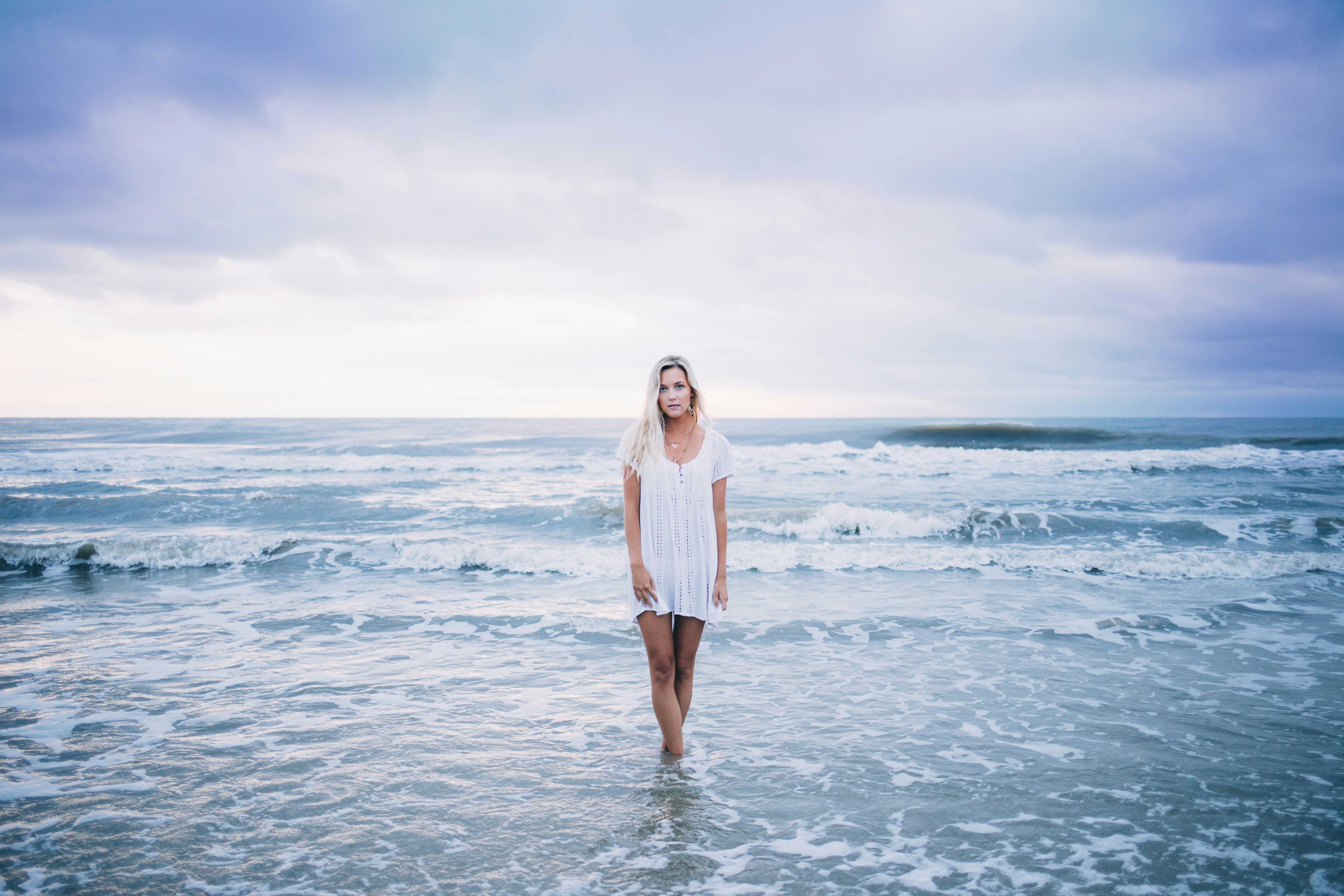 海洋,水,女人,女人,波浪,波紋,裙子,金發(fā),云,天空,多云,女孩,瓦芙,白色裙子,海灘,肉桂,vsco,動作,激勵,藍色