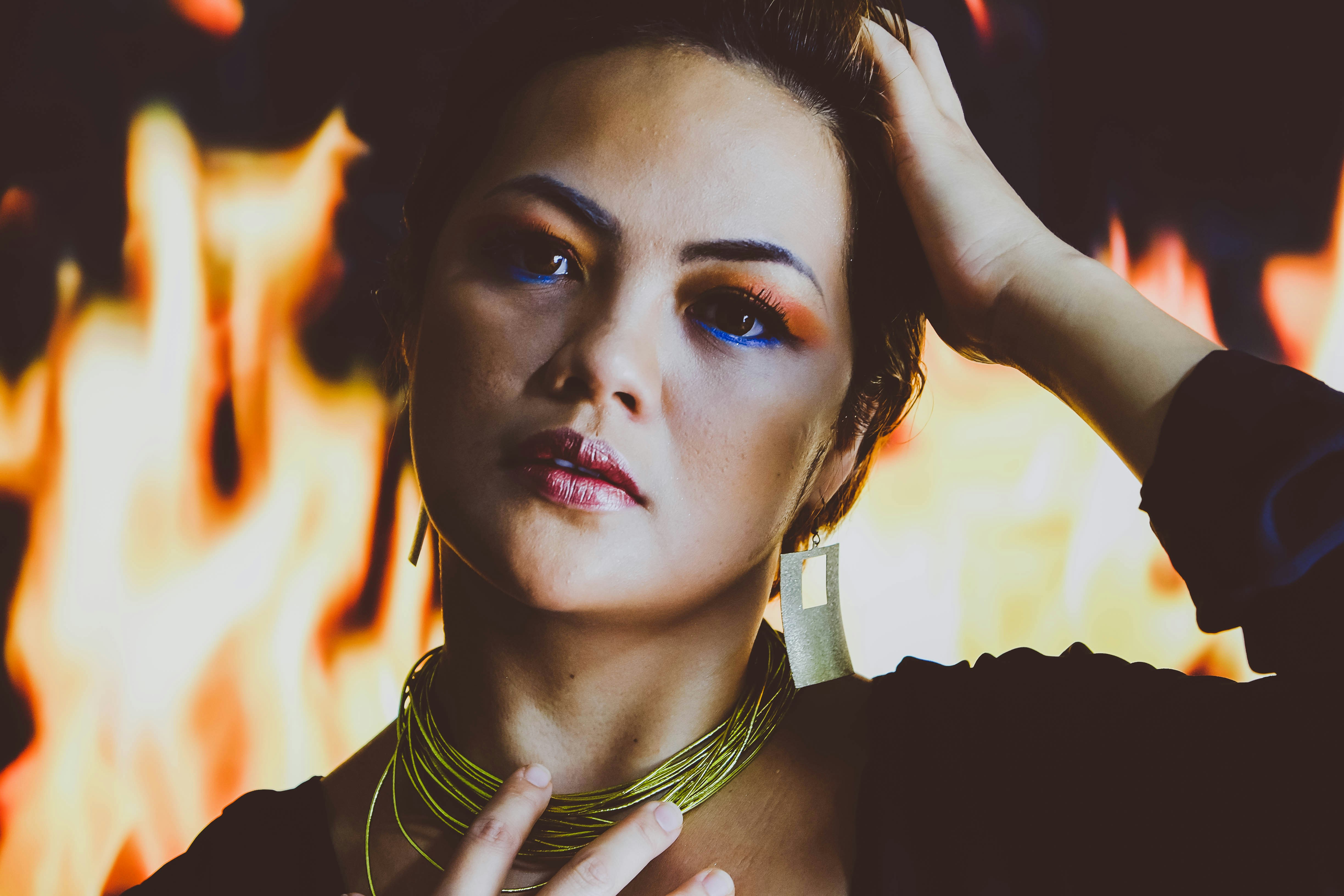 化妝、肖像、臉、模型、姿勢、自信、背光、火焰背光、工作室攝影、數碼攝影、概念、化身、攝影、元素、火焰