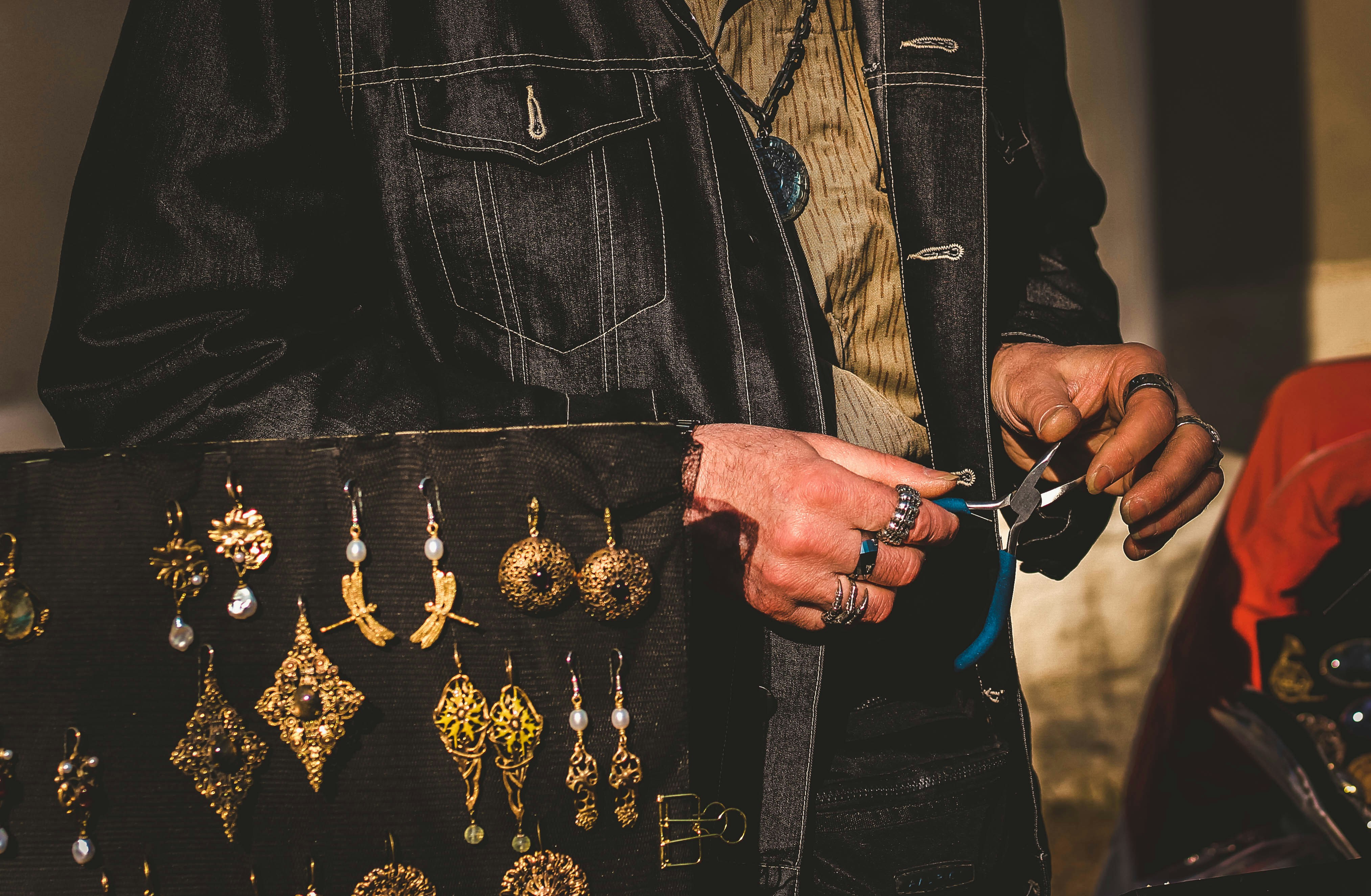 手,鉗子,牛仔,夾克,耳環(huán),戒指,特寫,藝人,藝術家,賣家,銀,金,遺產